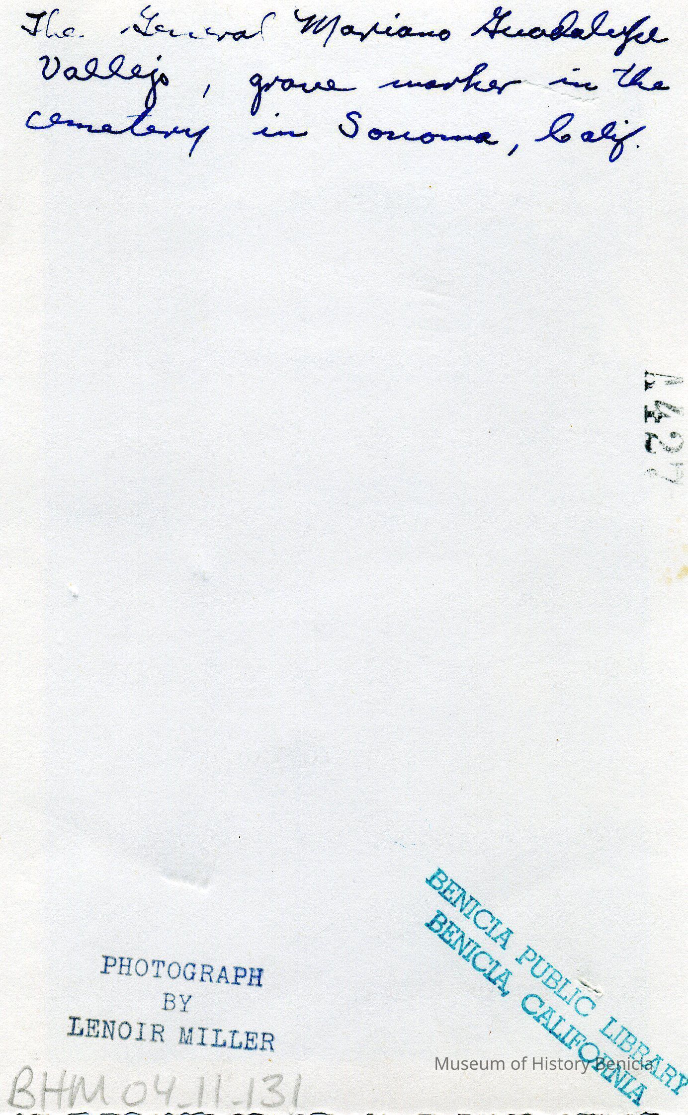 B/w photograph of General Vallejo's grave in Sonoma, California. The Lenoir Miller Collection.