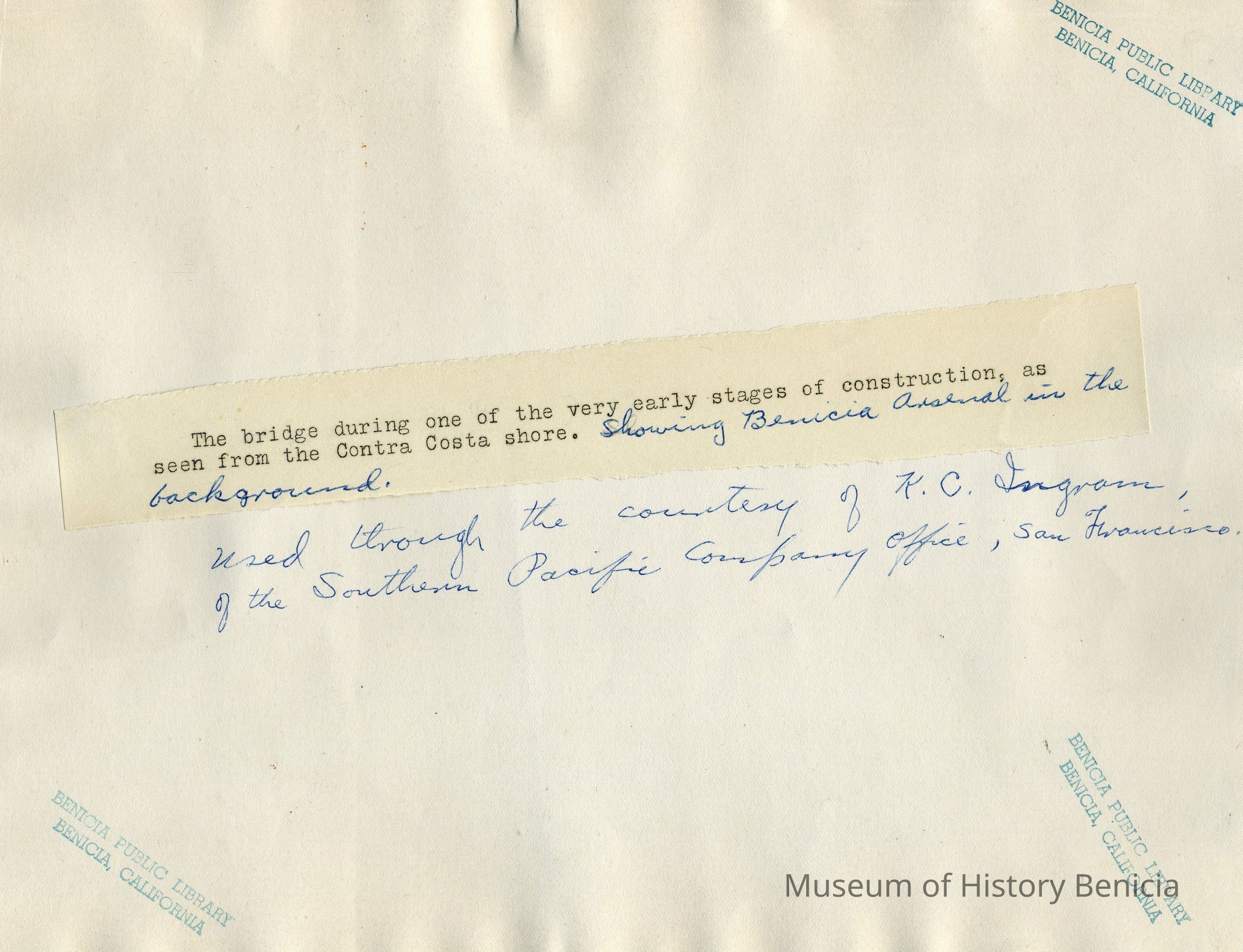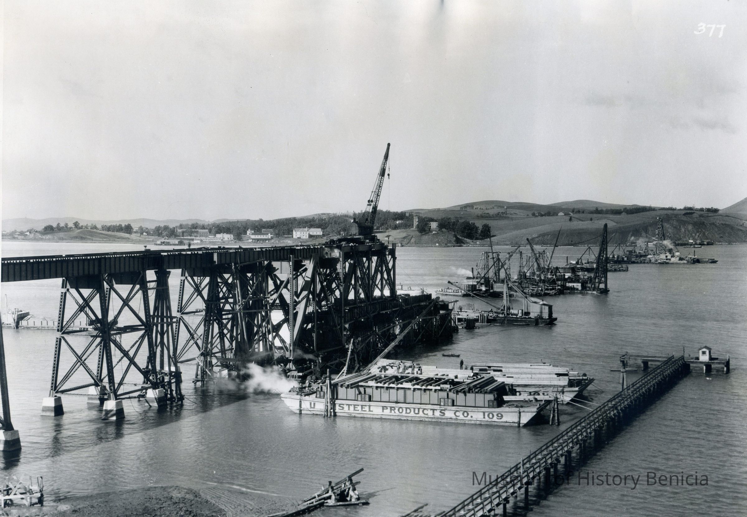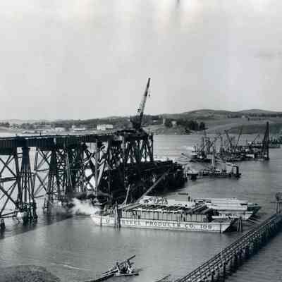 B/w photograph of the Suisun Bay Bridge (Benicia-Martinez Rail Bridge) under an early phase of construction. The Photo is taken from Contra Costa County, looking toward Benicia with the Arsenal in the background.Collection
