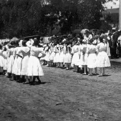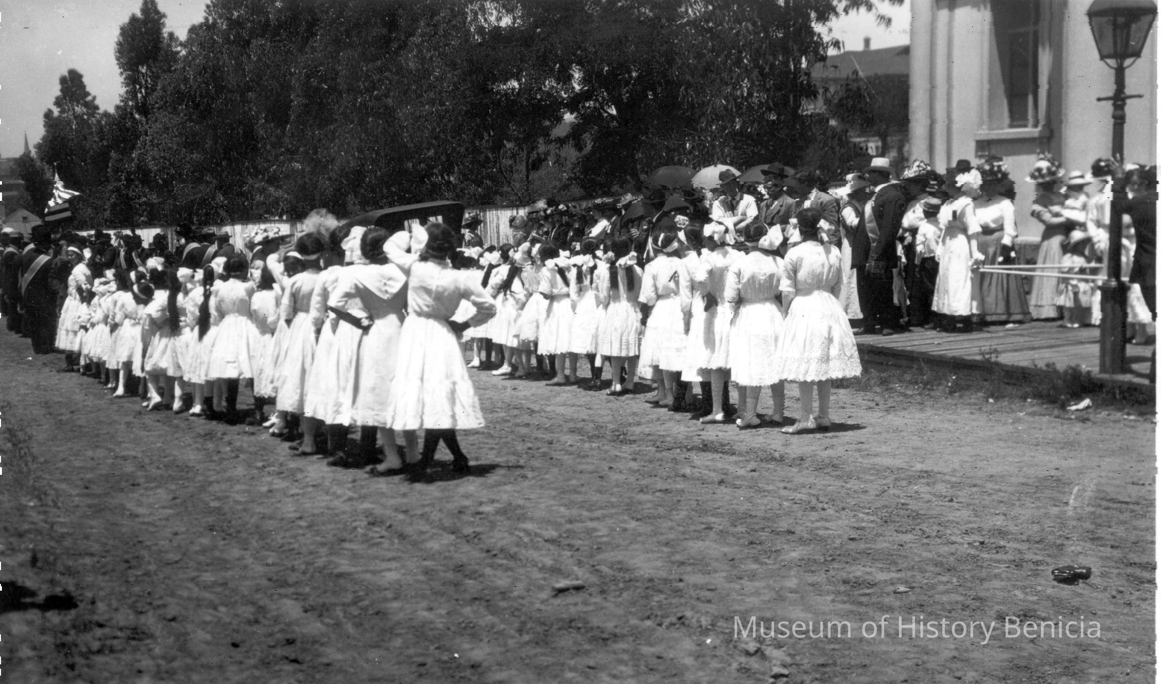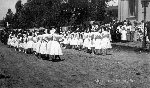 B/w photograph of a Portuguese celebration in front of St. Dominic's church in Benicia. The Lenoir Miller Collection.