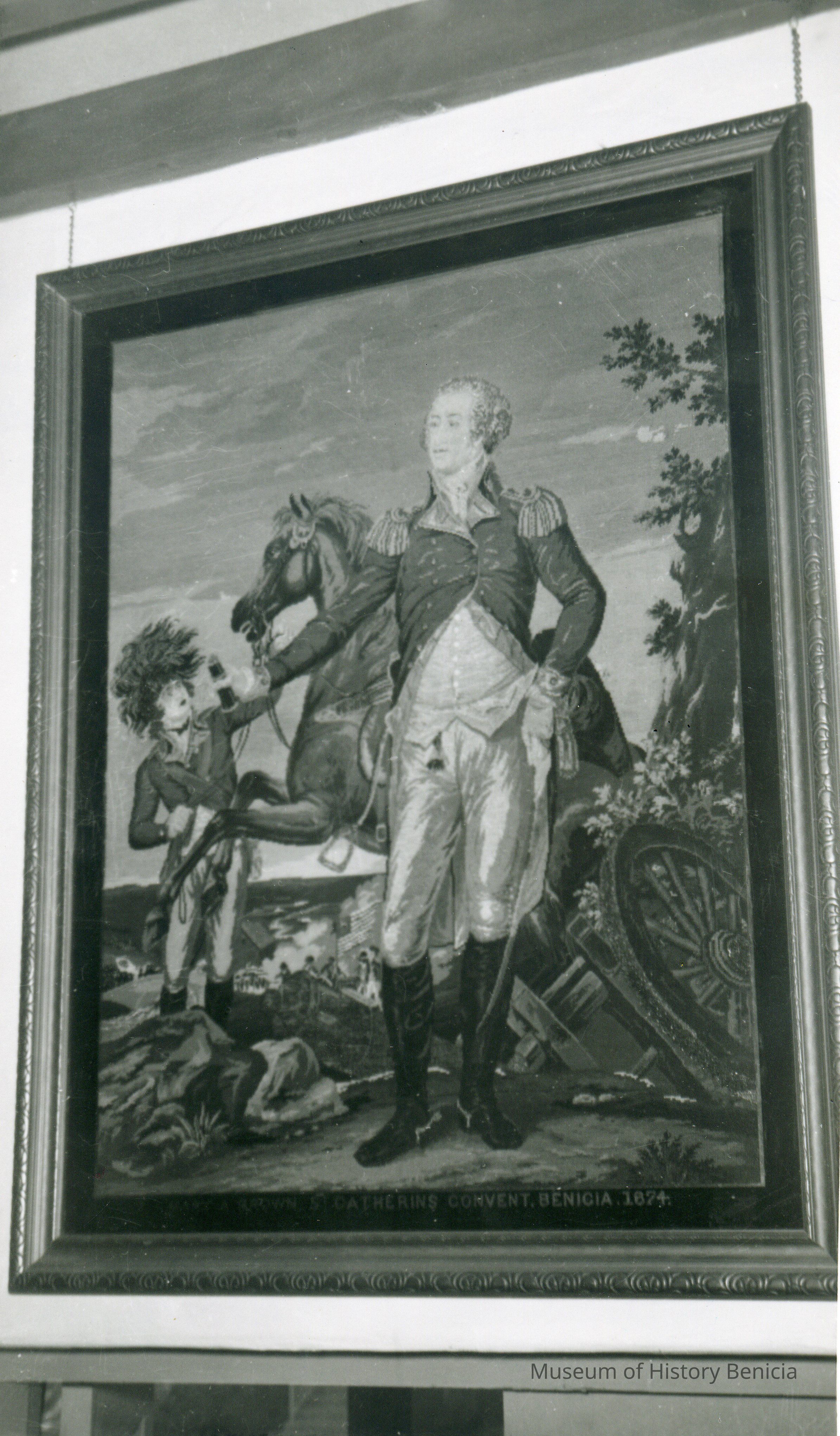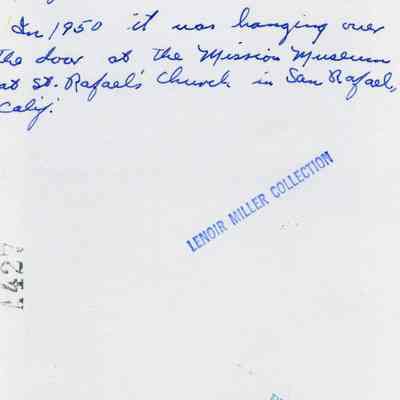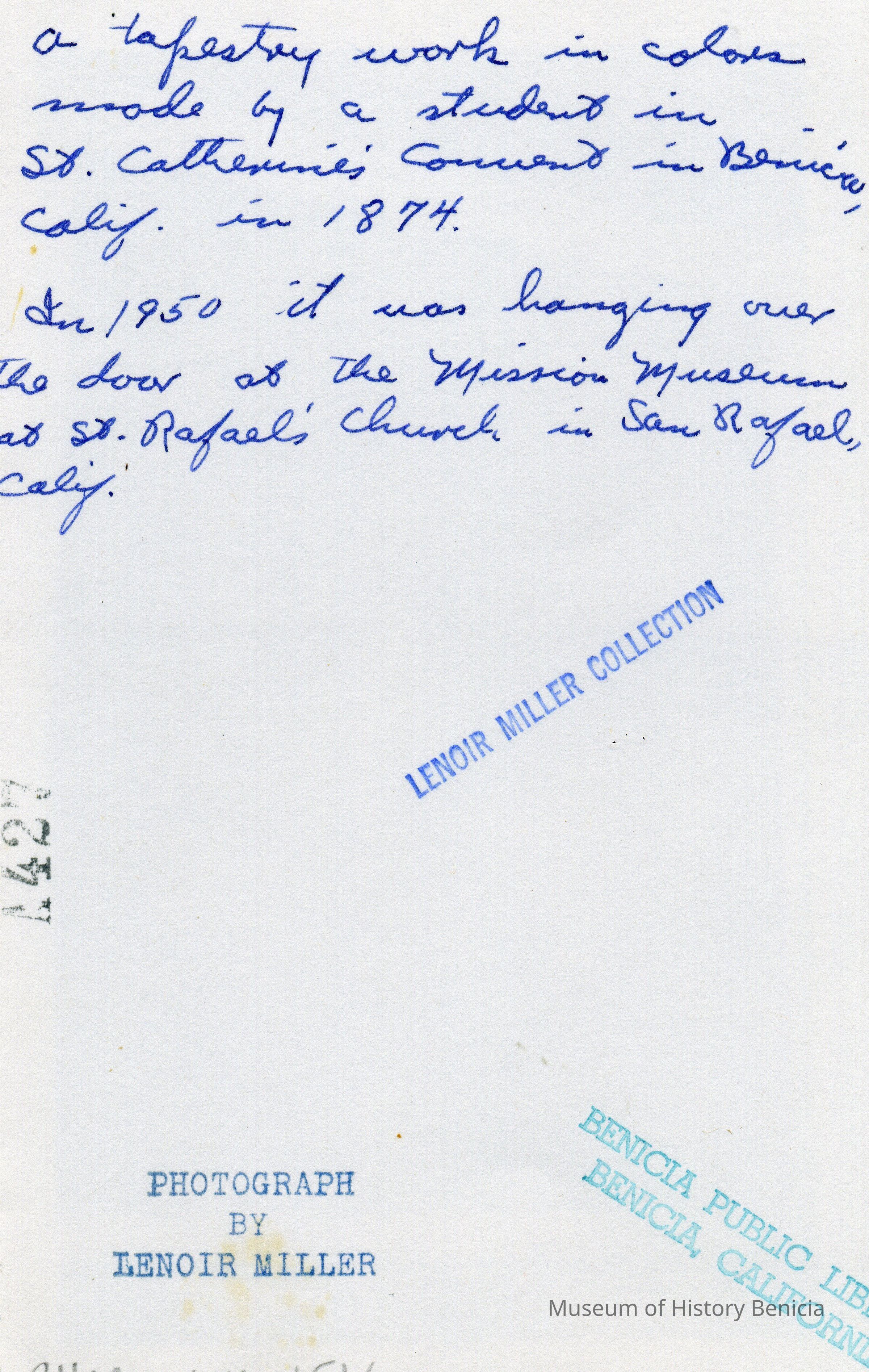 B/W photograph of a Tapestry work by a student from St. Catherine's Convent. Text on the reverse reads: "A tapestry work in colors made by a student in St. Catherine's Convent in Benicia, Calif. in 1874. In 1850 it was hanging over the door at the Mission Museum at St. Rafael's Church in San Rafael, Calif." The Lenoir Miller Collection.Collection
