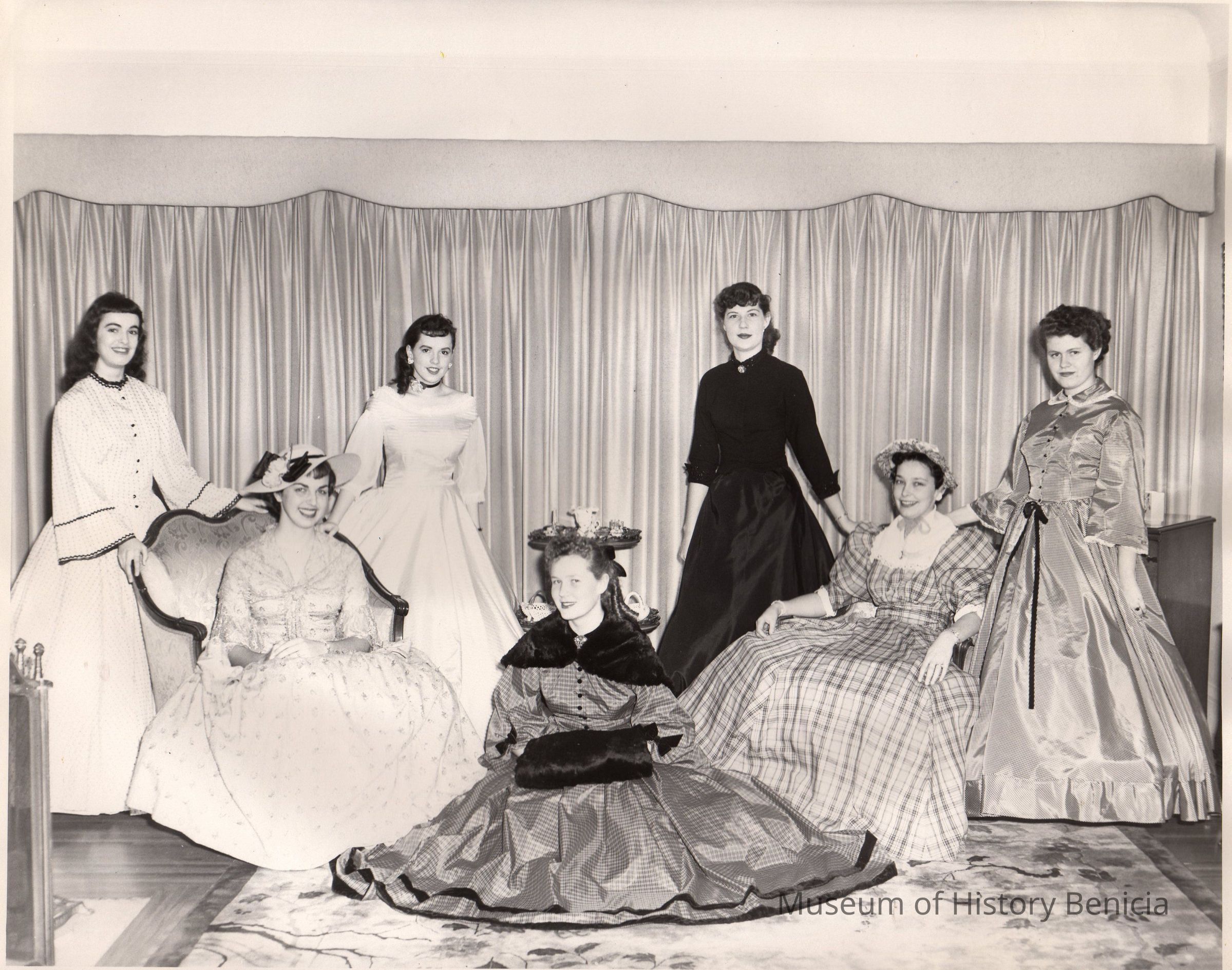 B/W photograph of 7 women in 19th century period dresses, seated and standing. The Lenoir Miller Collection. From left: Virginia Saitz, Louella Higginson, Norma Sharon, Karen Wold, Martha Miller, Joan Passalacqua (perhaps), and Delma Pinkham.