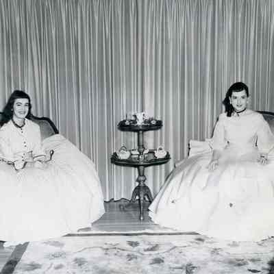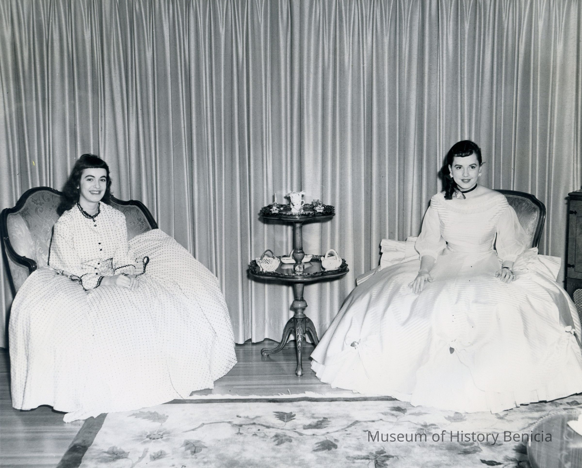 B/w photograph of 2 young women in white dresses, seated. The Lenoir Miller Collection.