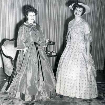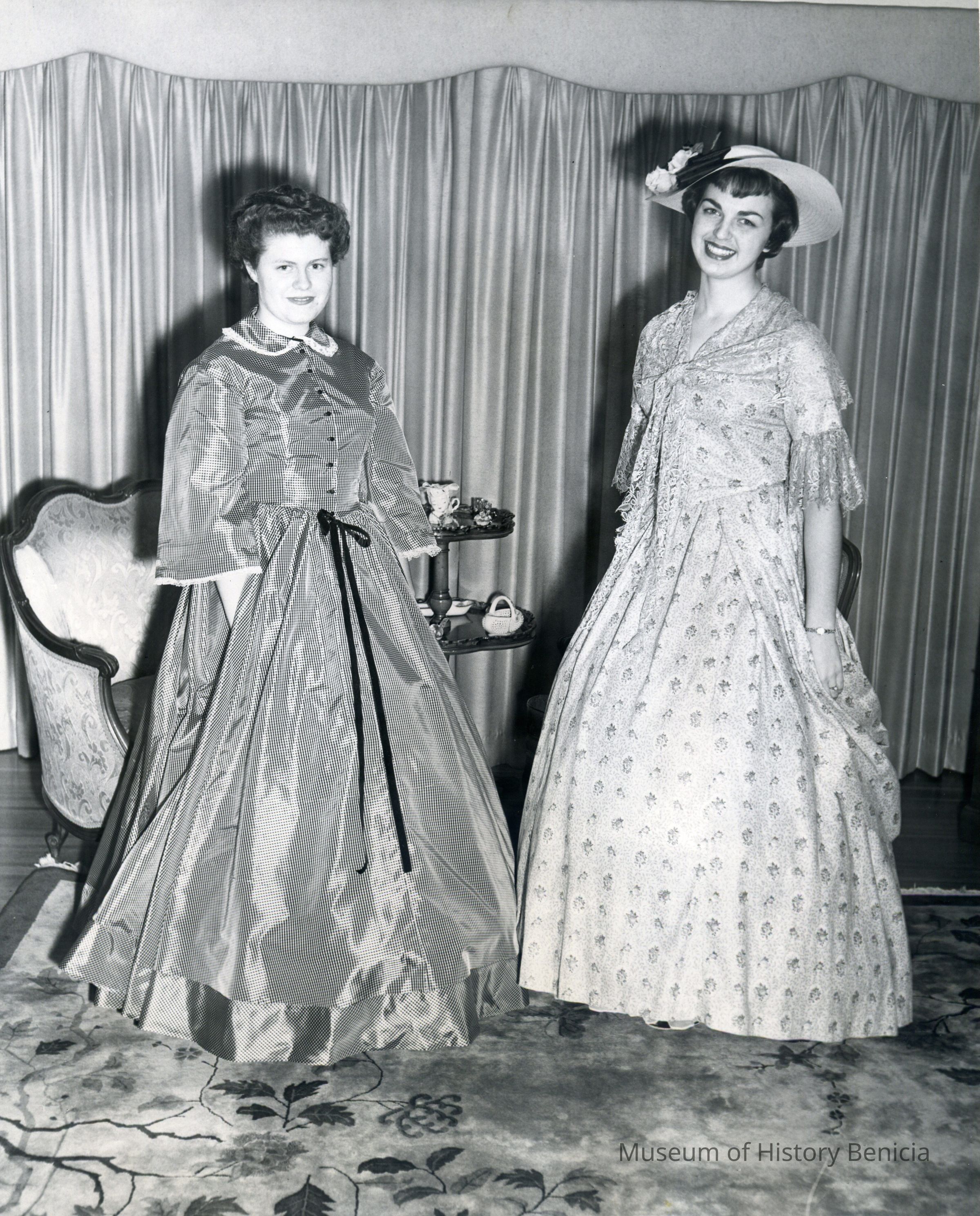 B/w photograph of two young women in 19th century period dress. The Lenoir Miller Collection. From Left: Delma Pinkham and Frances Bettencourt.