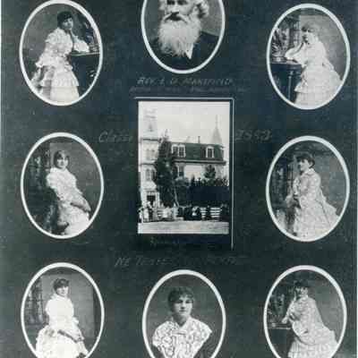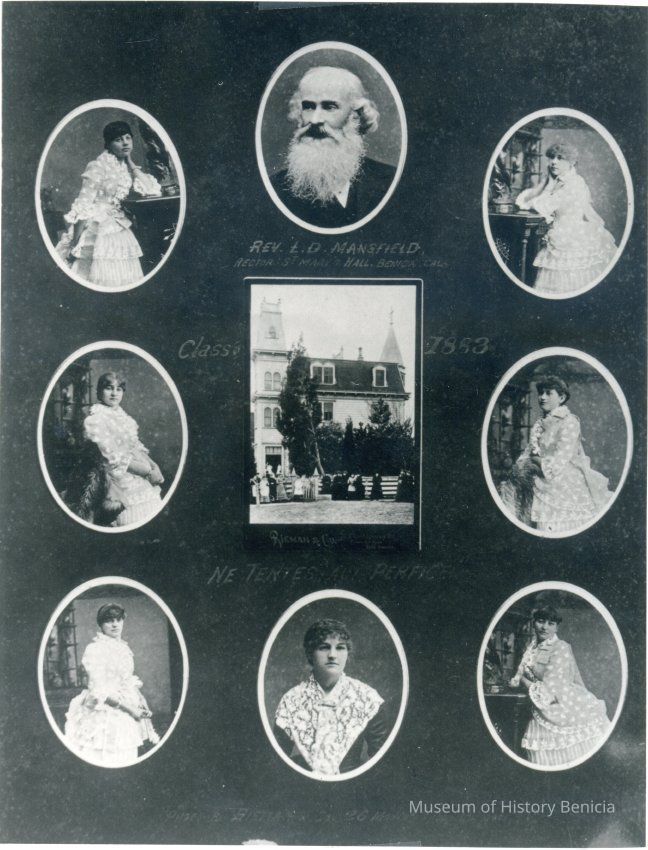 B/W graduation collage, 8 photographs in individual ovals arranged around a rectangular photograph of a building (the school?) 7 individuals are women (graduates-no names) 1 individual is a man with a long grey beard, Rev. L. D. Mansfield, Rector, St. Mary's Hall, Benicia.