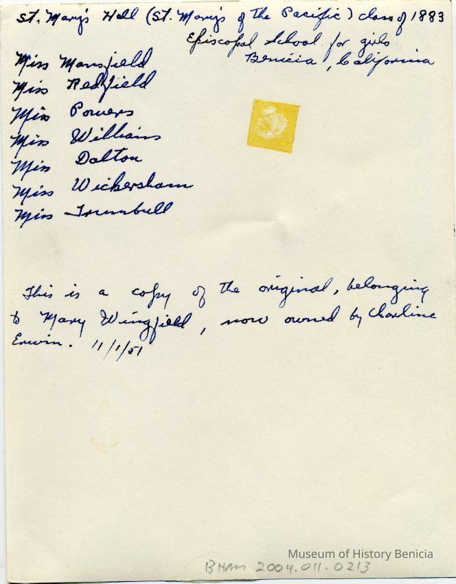 On the back it identifies the photo as St. Mary's Hall (St. Mary's of the Pacific) class of 1883. Episcopal School for girls Benicia, California.