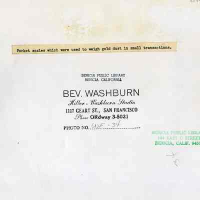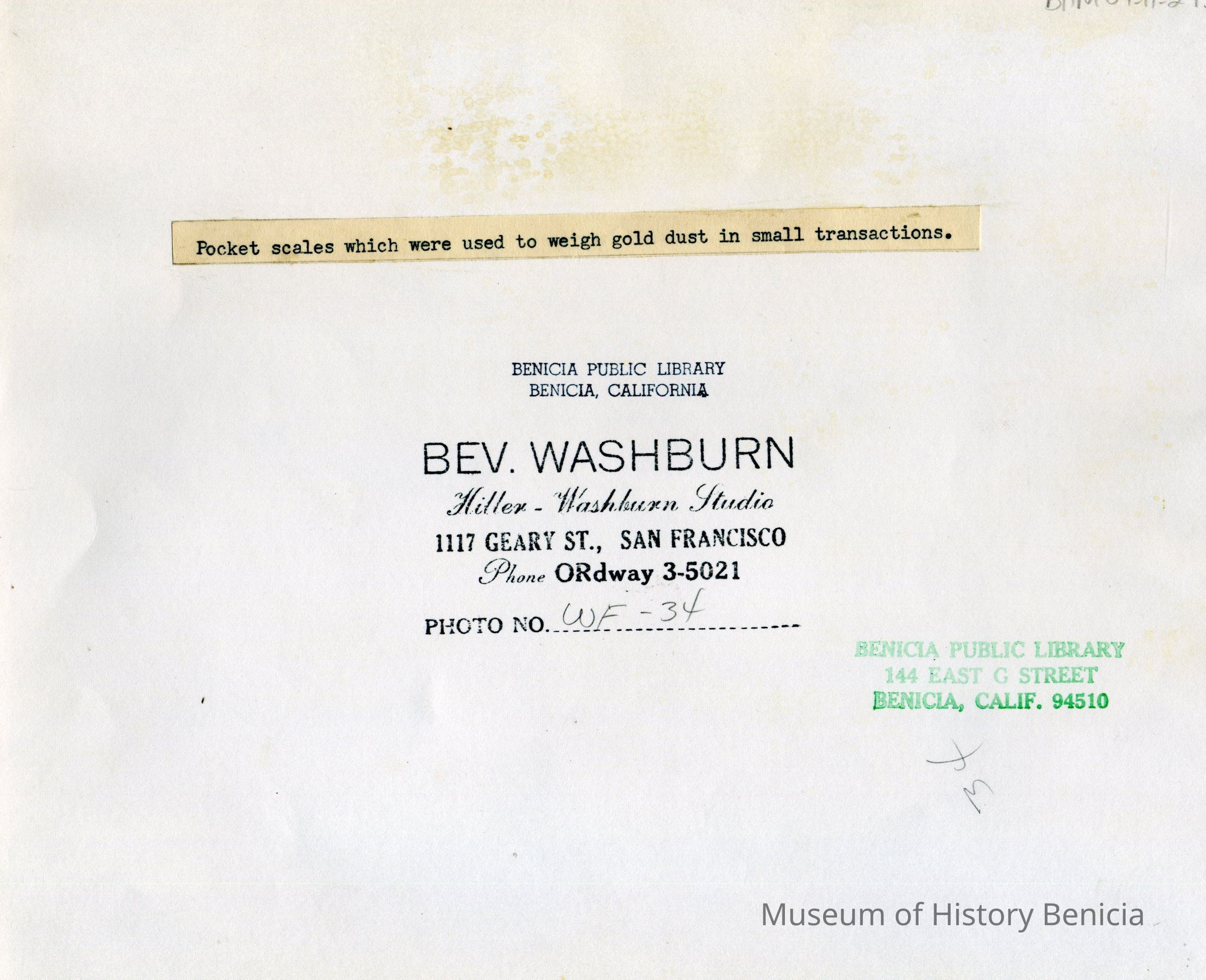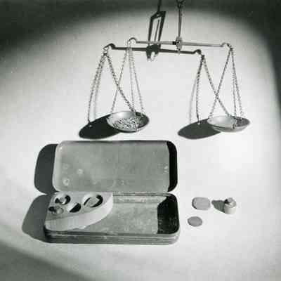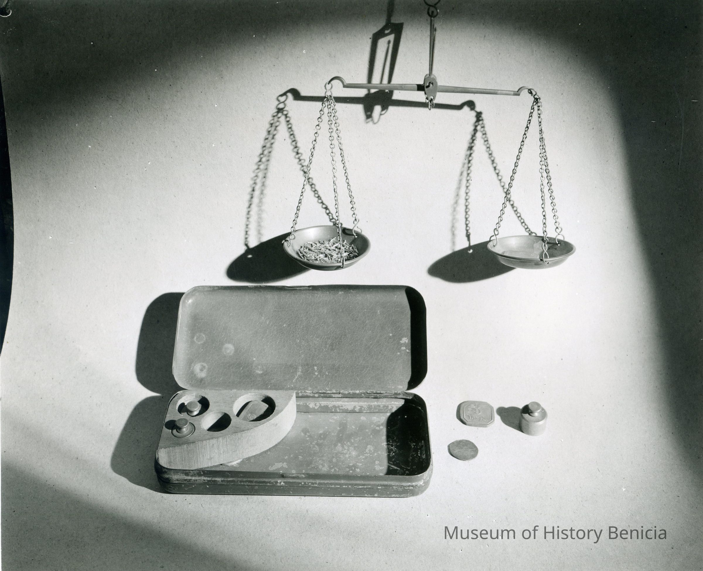 B/w photograph of pocket scales which were used to weigh gold dust in small transactions.