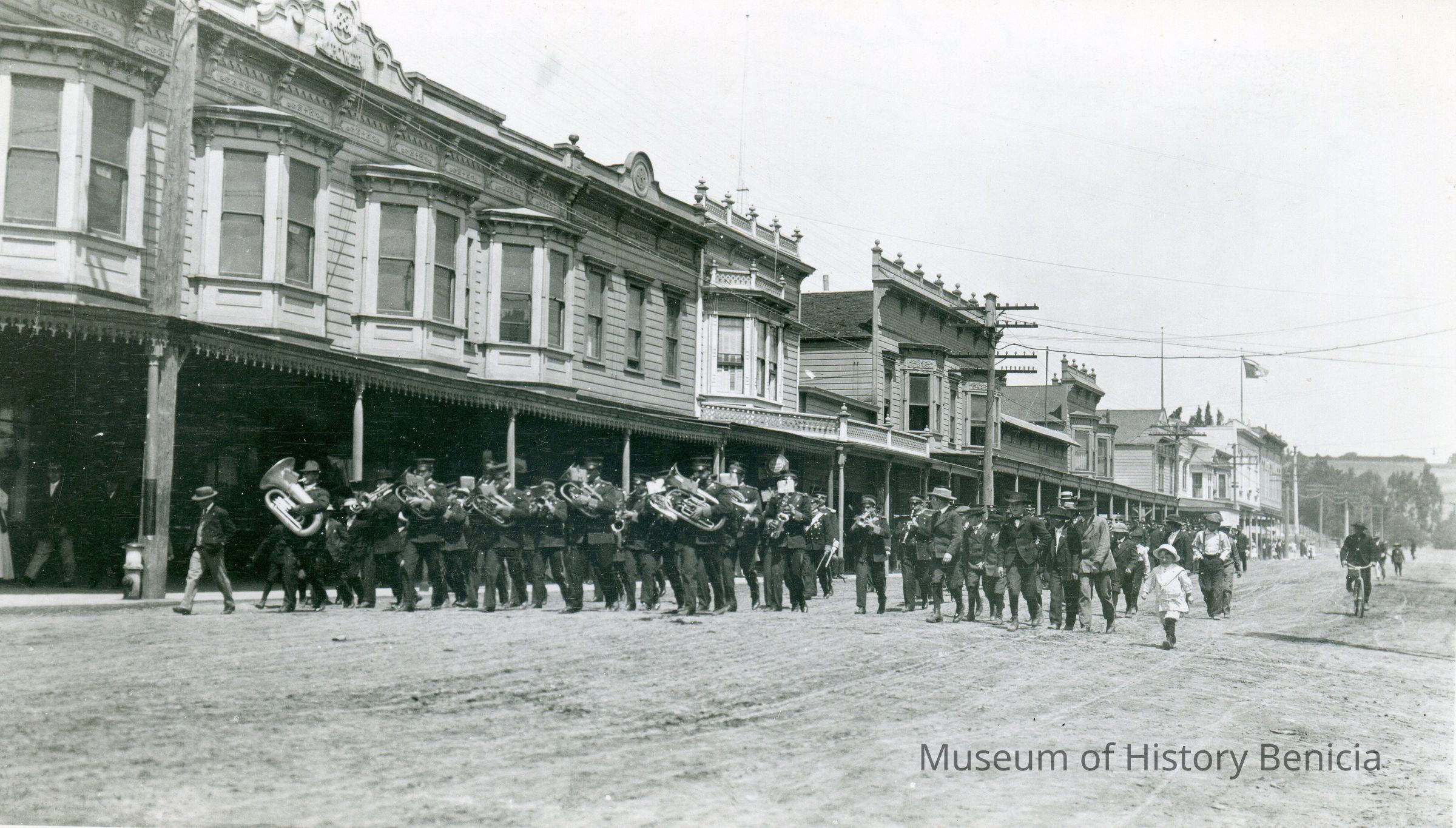 B/w photograph of a band parade down First Street, Benicia. The Lenoir Miller Collection.
