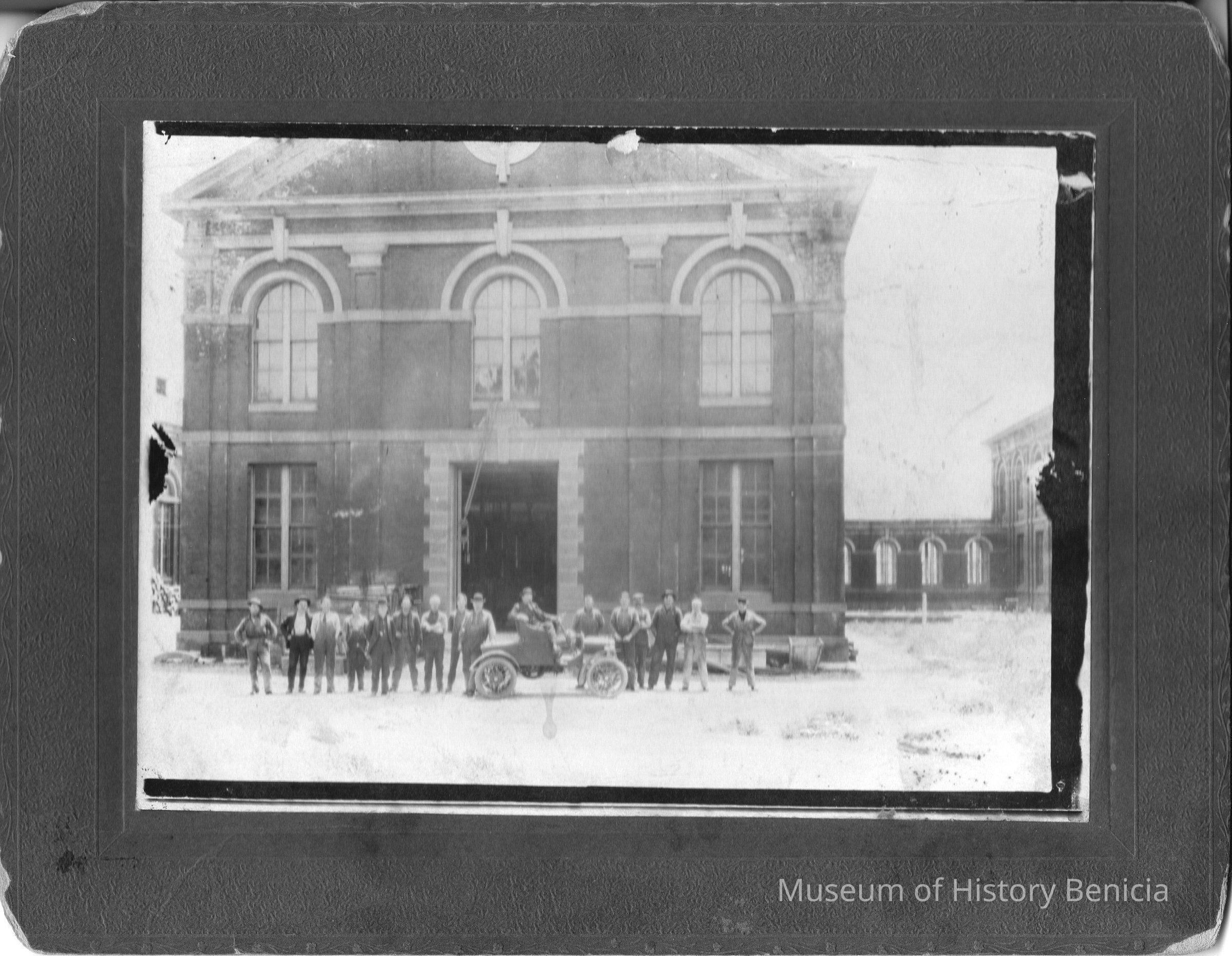 B/w mounted photograph of the "arsenal shop crew" posing in front of a building, with one man in a pre-1920s car.