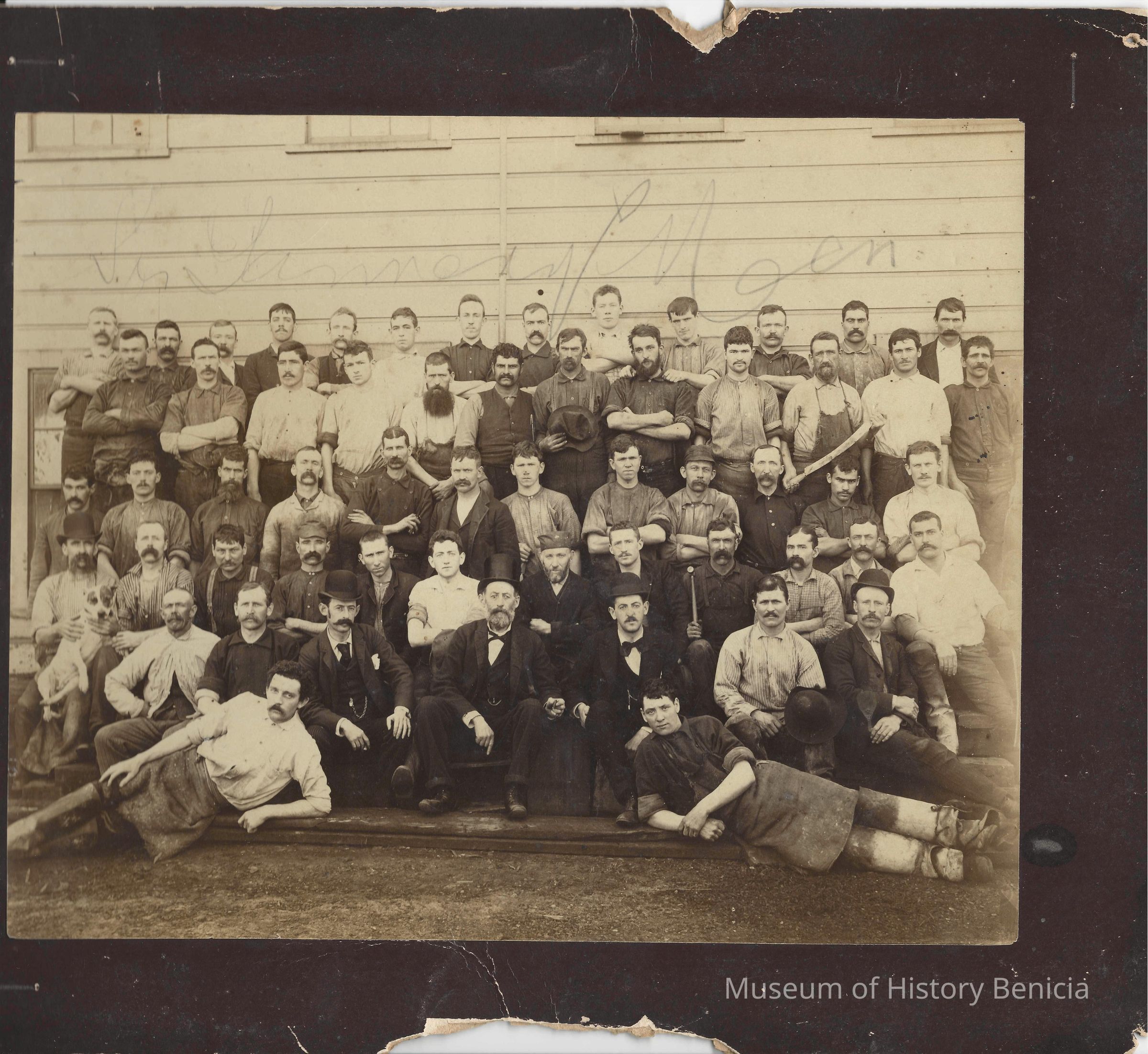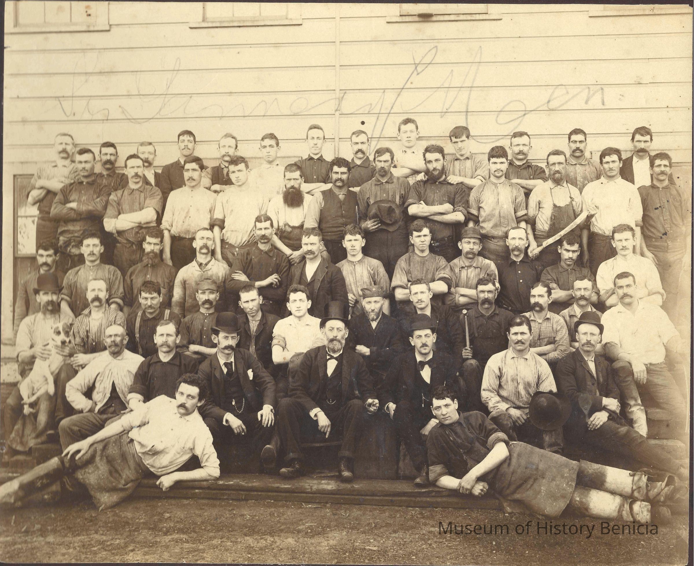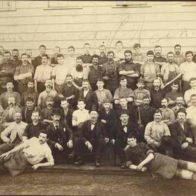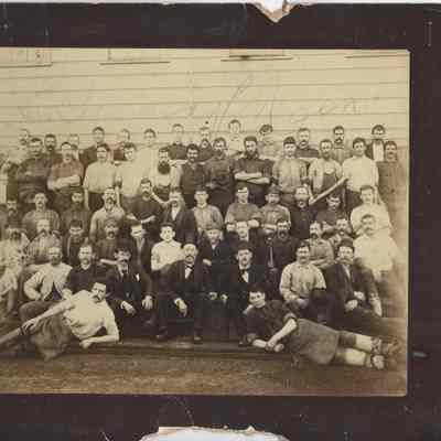 On the back is written "Tannery personnel, probably McKay Tannery" This is a photo of a group of men some of them are dressed in black suites others are wearing aprons and work clothes.Collection