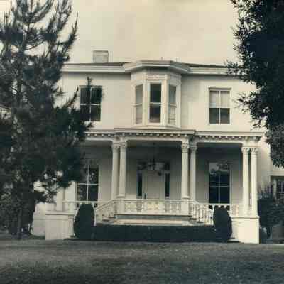 B/W matted photograph of the Commandant's Home. There is a small tree partially blocking to view of the veranda.