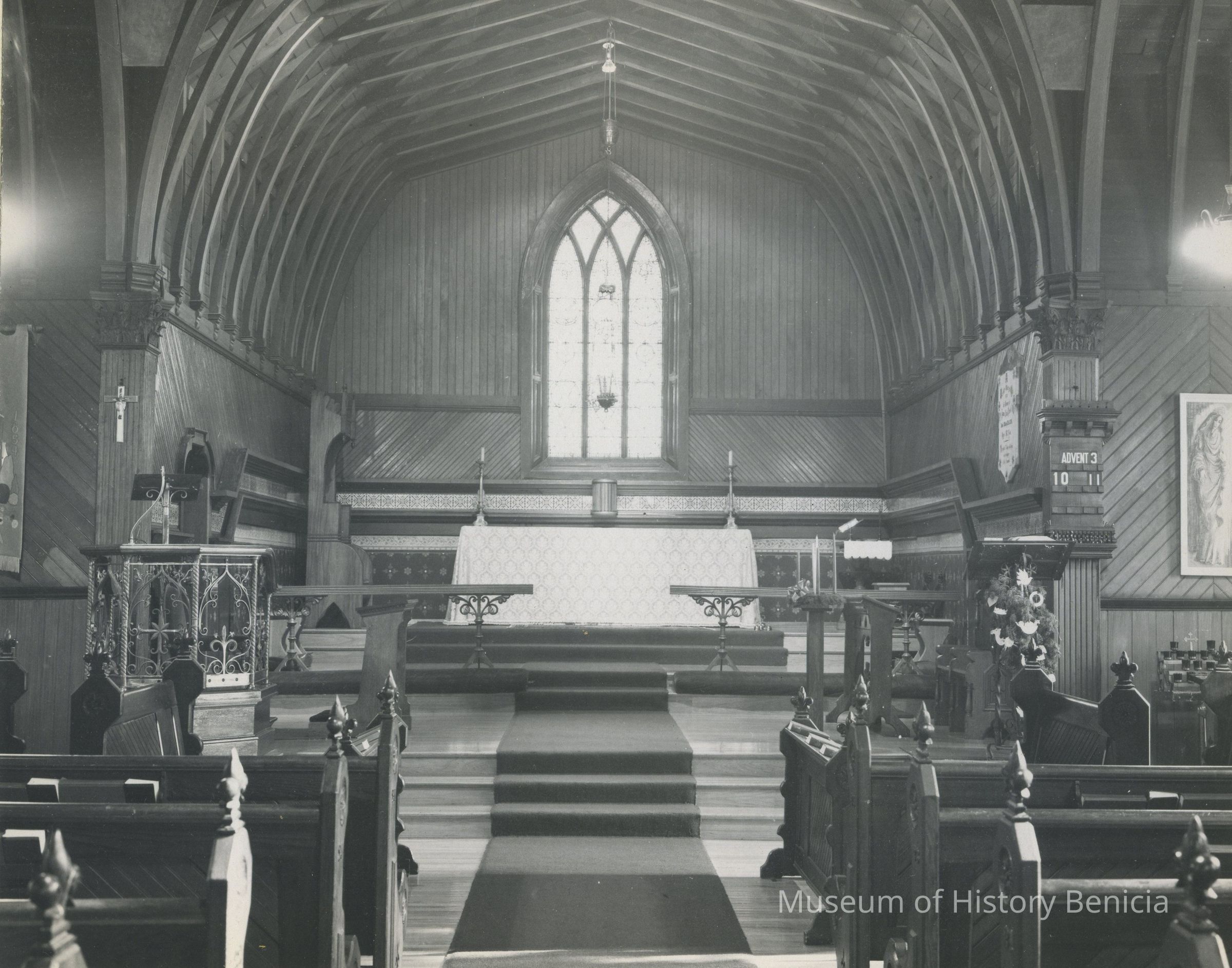 B/W photograph originally under glass in a black frame with gold trim. The photograph is glued to a mat board. It shows the interior of St. Paul's Church, focusing on the altar area. A caption underneath the photo reads: " The Nautical Heritage of St. Paul's is reflected in the ceiling which resembles an inverted ship's hull, and is similar in design to that of the Norwegian Stave Churches. California Redwood and wooden dowels were employed".Collection