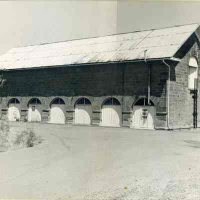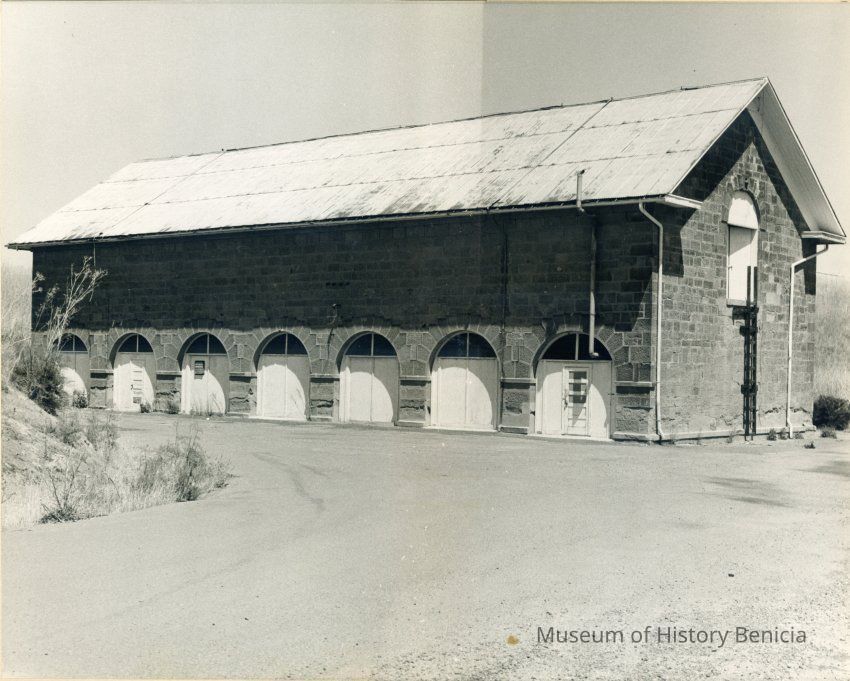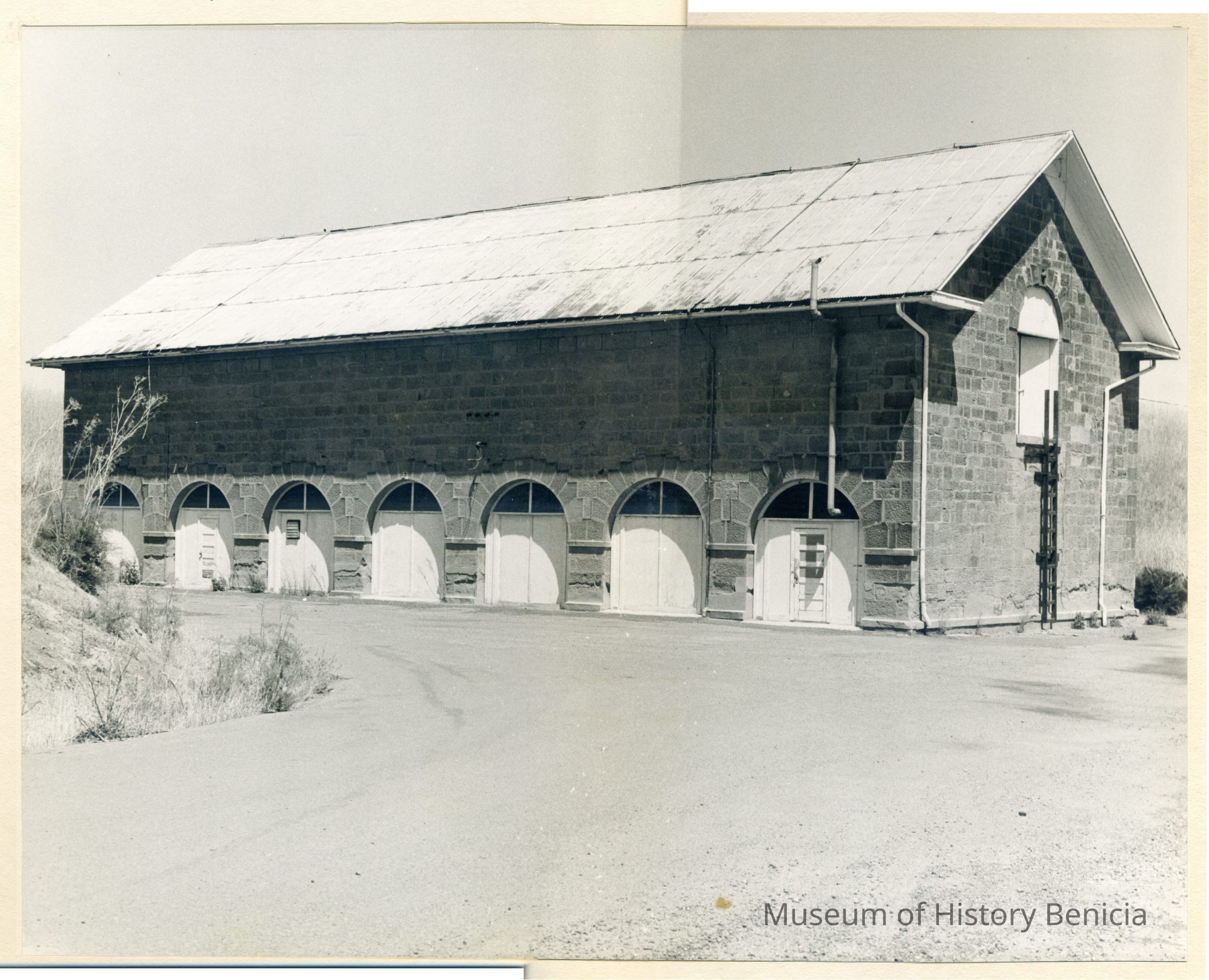 B/W matted photograph of the Camel Barn, Building #7, Benicia Arsenal. It was taken prior to the museum occupancy.