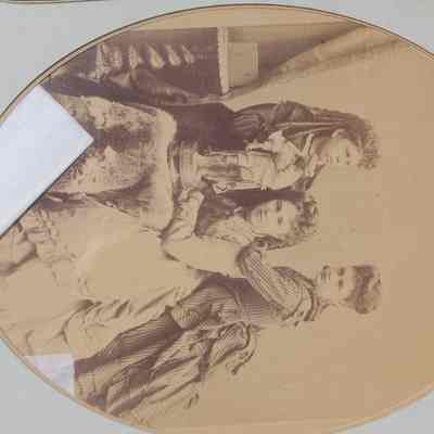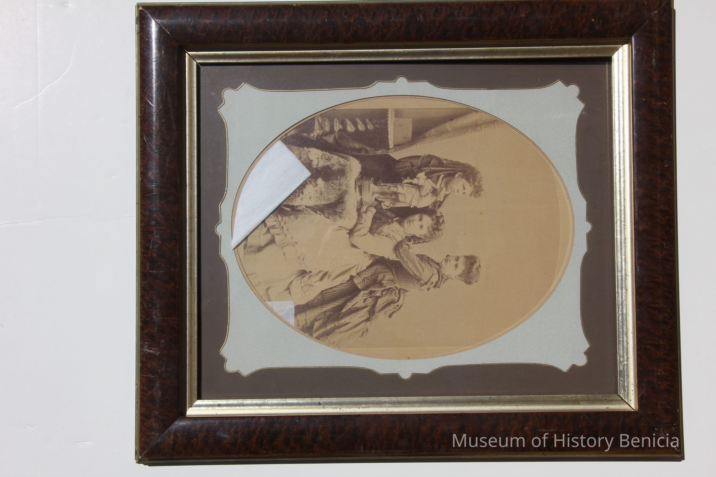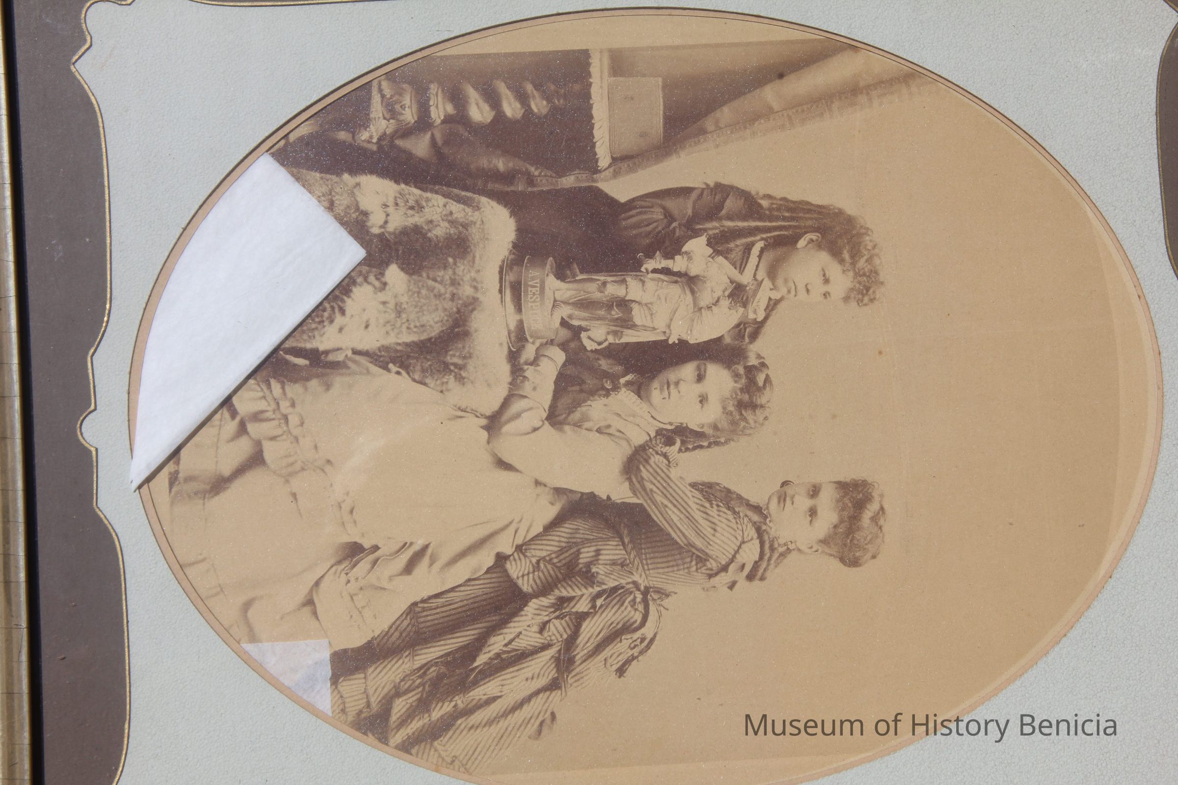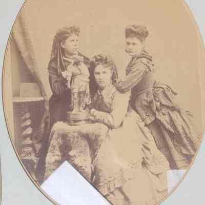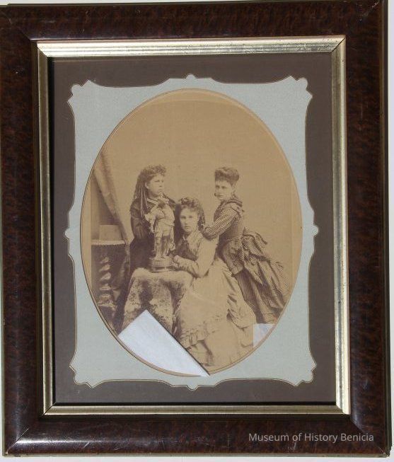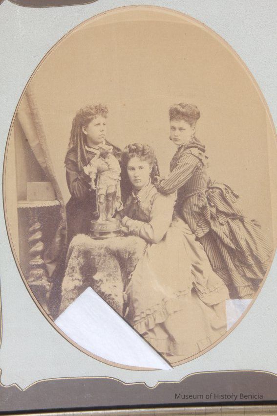 three young women pose w/statue of "A. Vespuce" on fur-covered table. Two women stand on either side of seated woman (Elizabeth Fischer). Mounted on cardboard w/gold edging, printed and stamped "Bradley & Rulofson San Francisco" at bottom.Collection