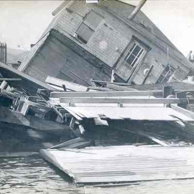 Building is collapsing into the bay. Lots of broken wood that was once apart of the pier.