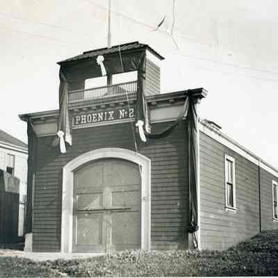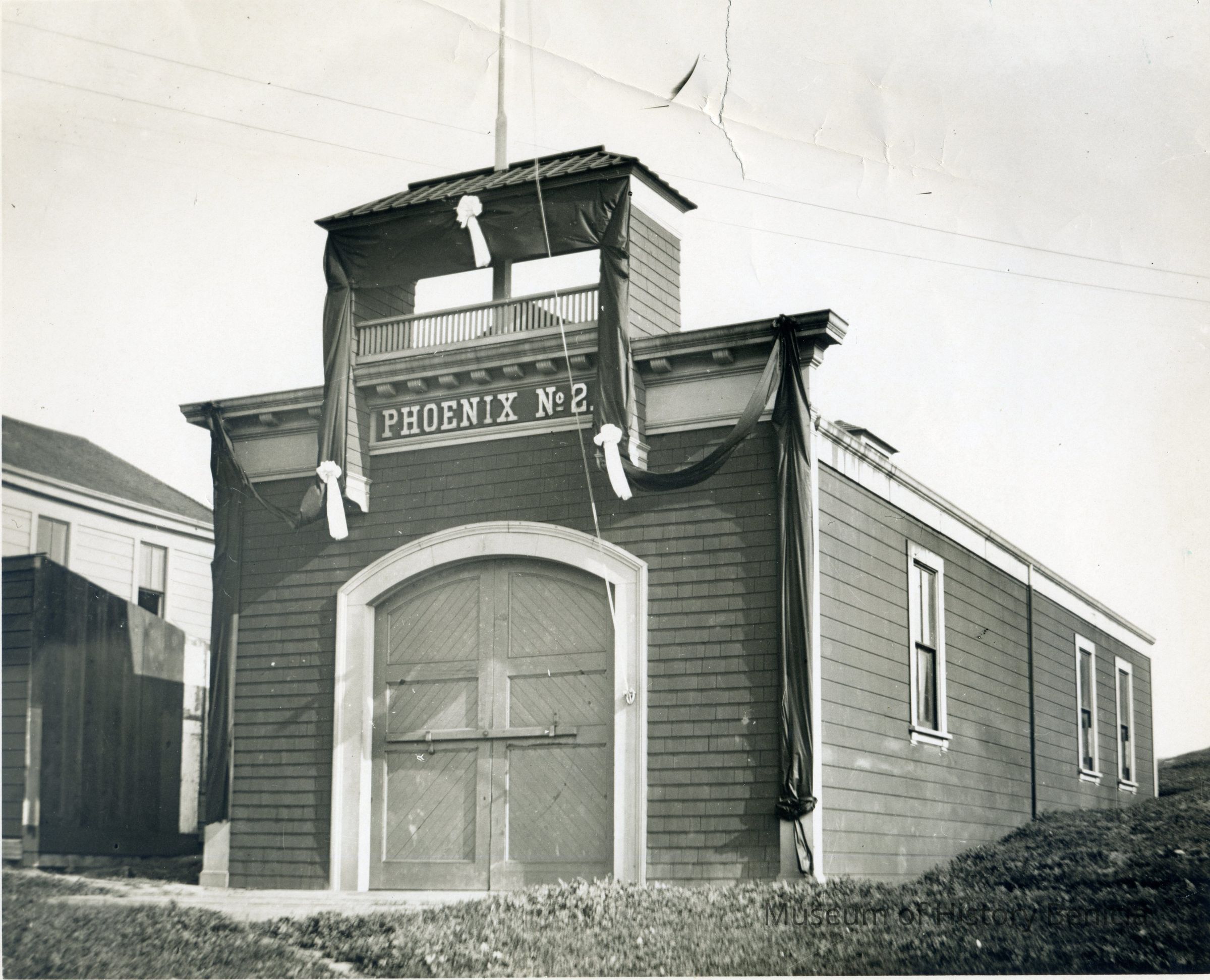 Photo of Phoenix No. 2 draped in black ribbon with three ribbons around the facade.