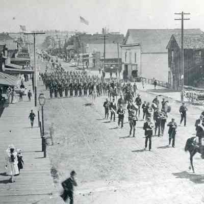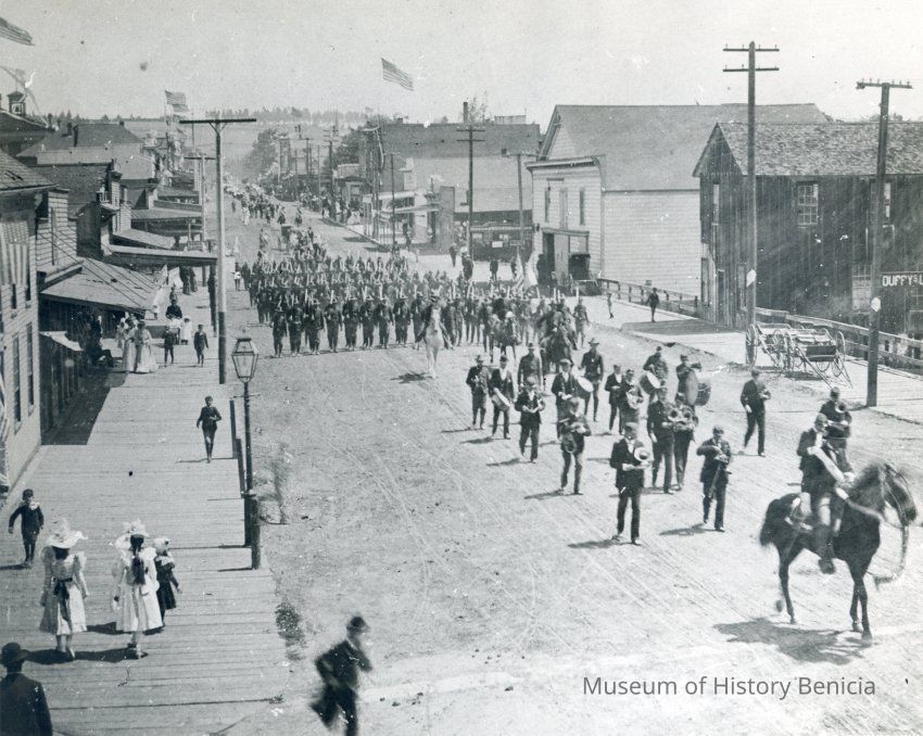 Early photograph of Benicia. There is a parade marching down an unpaved First Street.