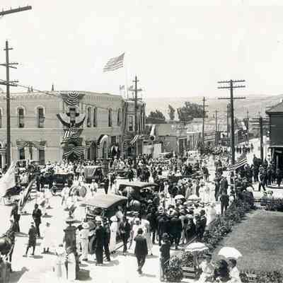 Scene of First Street, which is very crowded with people milling around. American flags are hanging from every building.