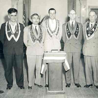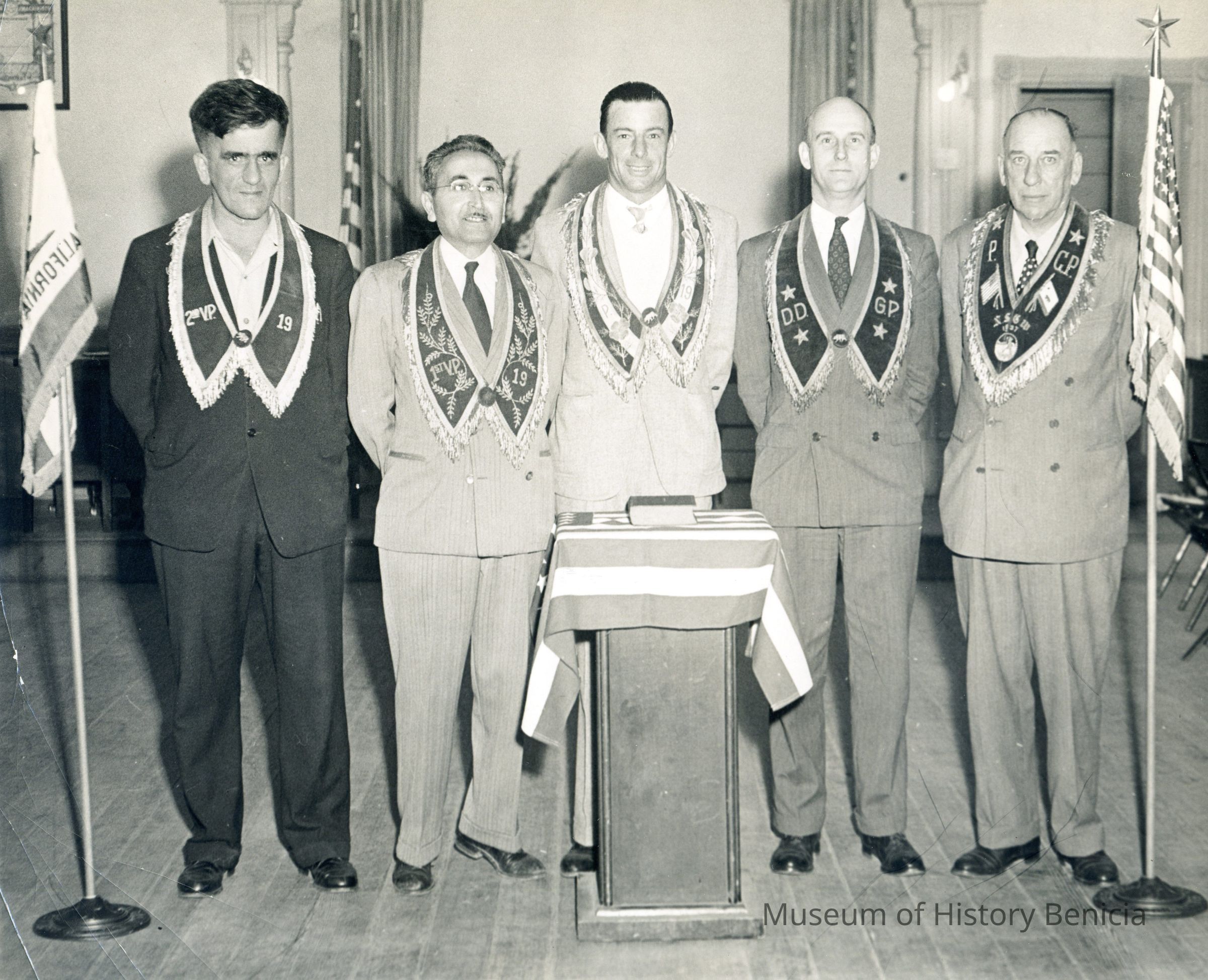 Four men dressed in suits standing side by side. Each man is wearing something draped around their shoulders. There is an American flag draped over a podium with a book on top.Collection