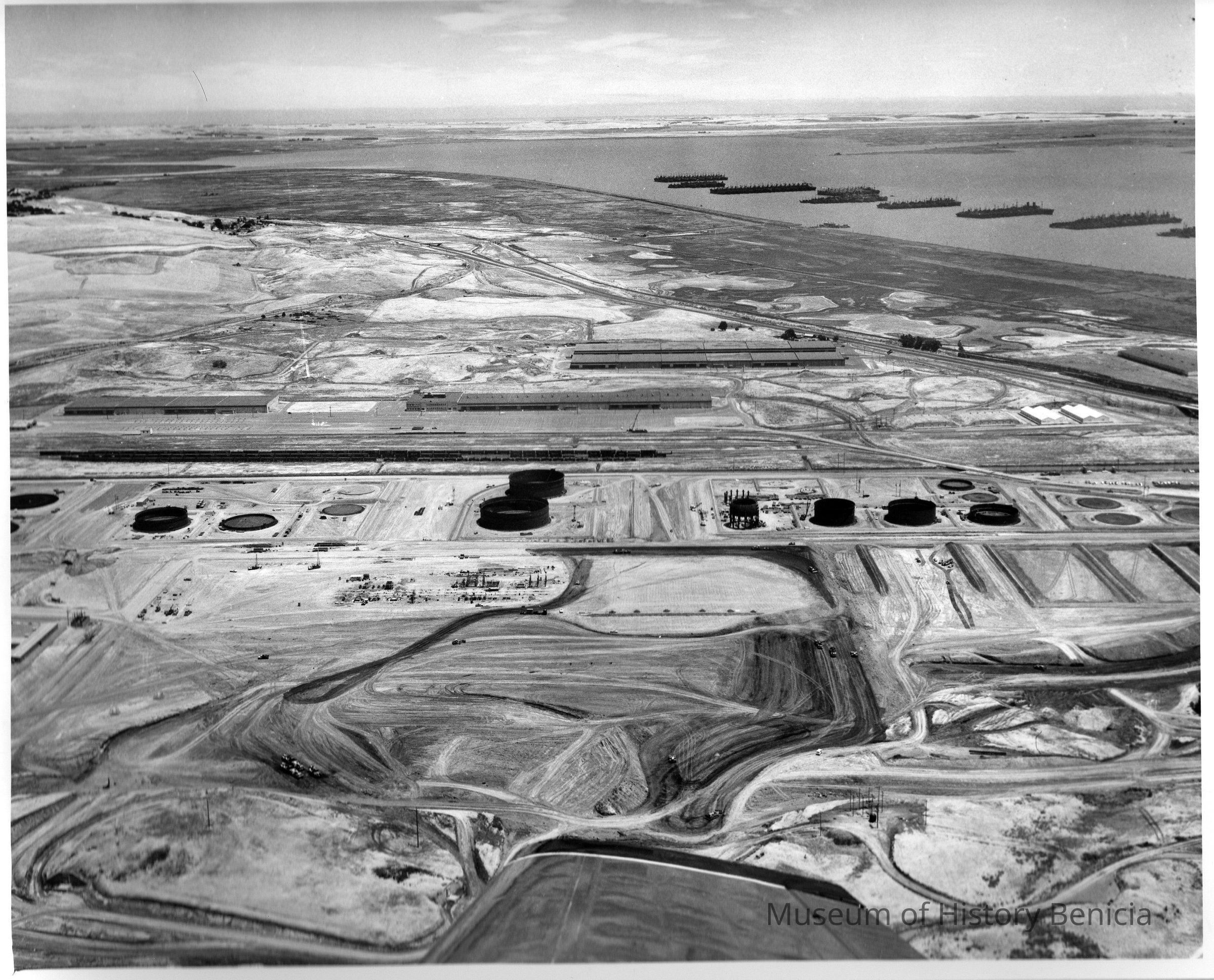 looking northeast: Suisun Bay and most of Reserve (Mothball) Fleet in upper right corner; in center: black storage tanks partially complete, skeletons of other equipment and railroad cars on sidings; lower part: graded pads and roads with construction equipment visible; 680 freeway shown middle right to upper left; East Second St. from middle left to connection with 680 freeway in upper middle of photo.