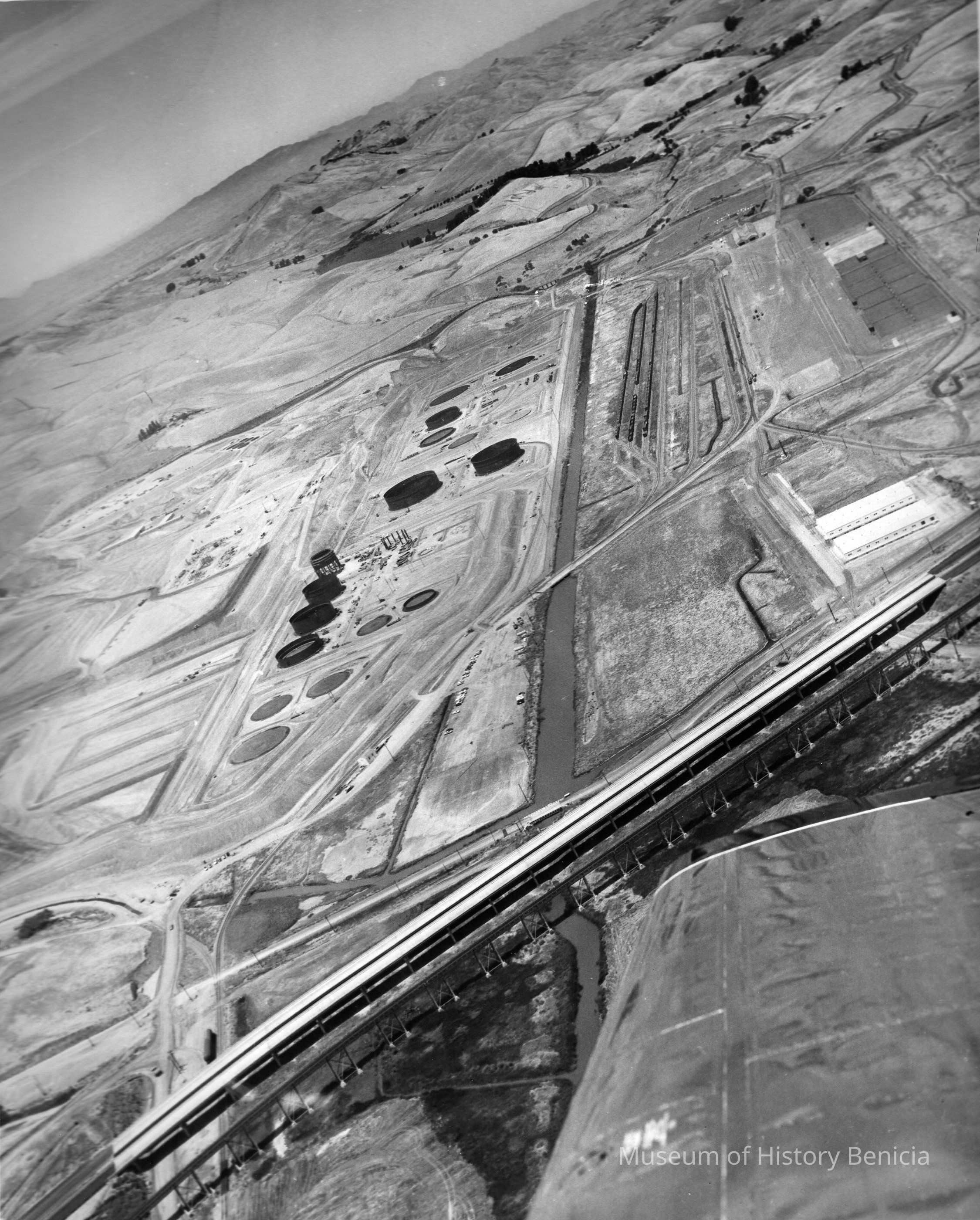 B/W aerial photo of early construction of the Humble Oil Refinery (later Exxon and Valero) looking north west ; 680 freeway and railroad trestle go from lower left to middle right, a water way goes from bottom center to 2" below the top; incomplete storage tanks and other equipment are in center; warehouses and train cars on sidings are to right center; natural hills and Lake Herman are in upper portion of photo.