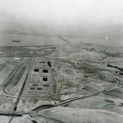 center area: storage tanks under construction, concrete circular pads, graded pads and access roads; left center: warehouses and train cars on sidings; right center: Highlands subdivision and East Second Street (continuing across bottom section; lower right corner is a farm with buildings, including a barn.Collection