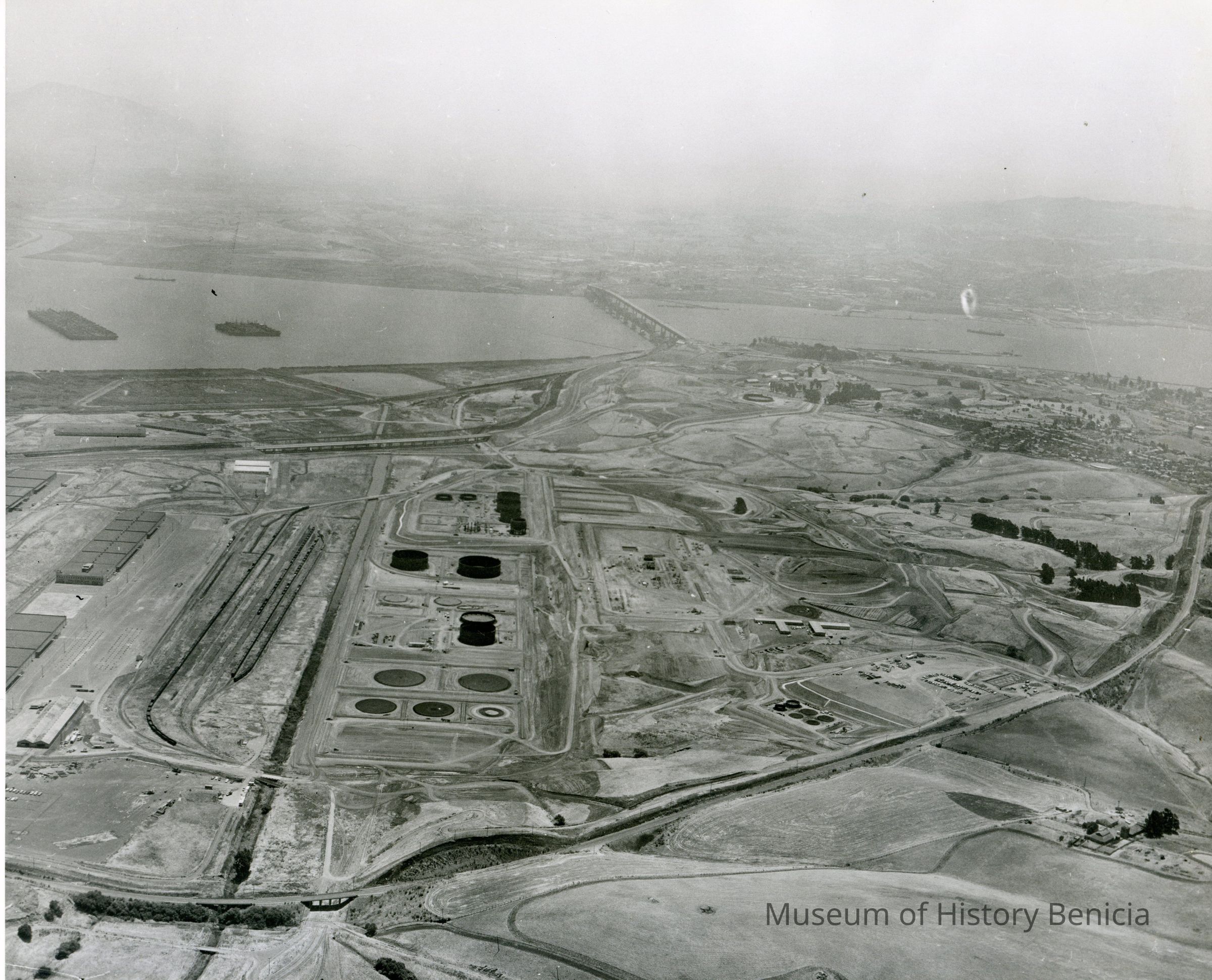 B/W aerial photo of early construction of the Humble Oil Refinery (later Exxon and Valero) looking east, top section: cloud cover over Contra Costa County, Benicia-Martinez Bridge and SP Railroad Bridge and a few ships in the Reserve (Mothball) Fleet and Suisun Bay;