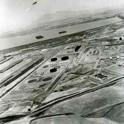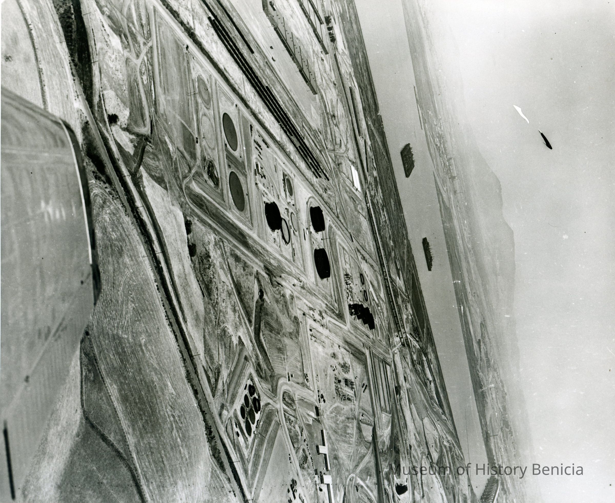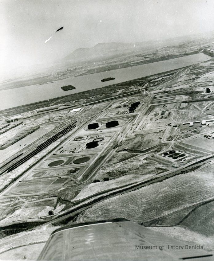 B/W aerial photo of early construction of the Humble Oil Refinery (later Exxon and Valero) looking east, top section: Mt. Diablo and some ships of the Reserve (Mothball) Fleet in Suisun Bay; center: 680 freeway, storage tanks under construction, warehouses (left) and train cars on sidings (left), buildings and graded pads; bottom section: East Second St. and plowed fields.