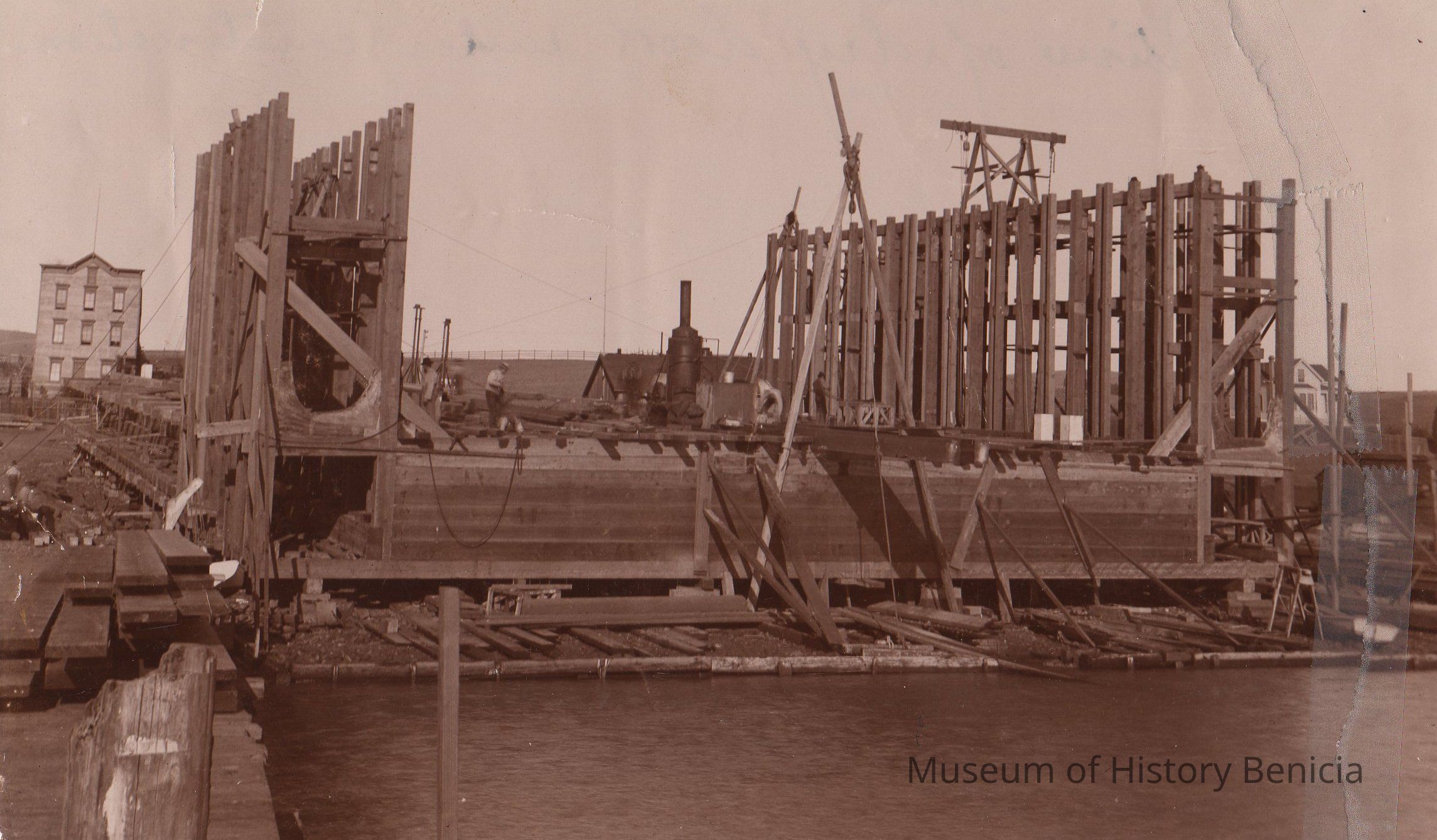 B/W Photograph: A floating drydock is under construction at Turner Shipyard in 1895 for the California Dry Dock Company in San Francisco.