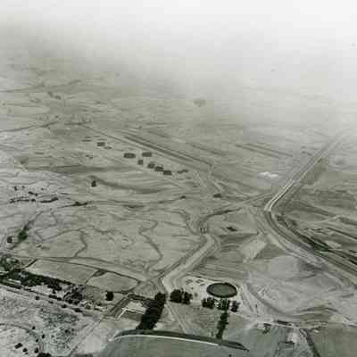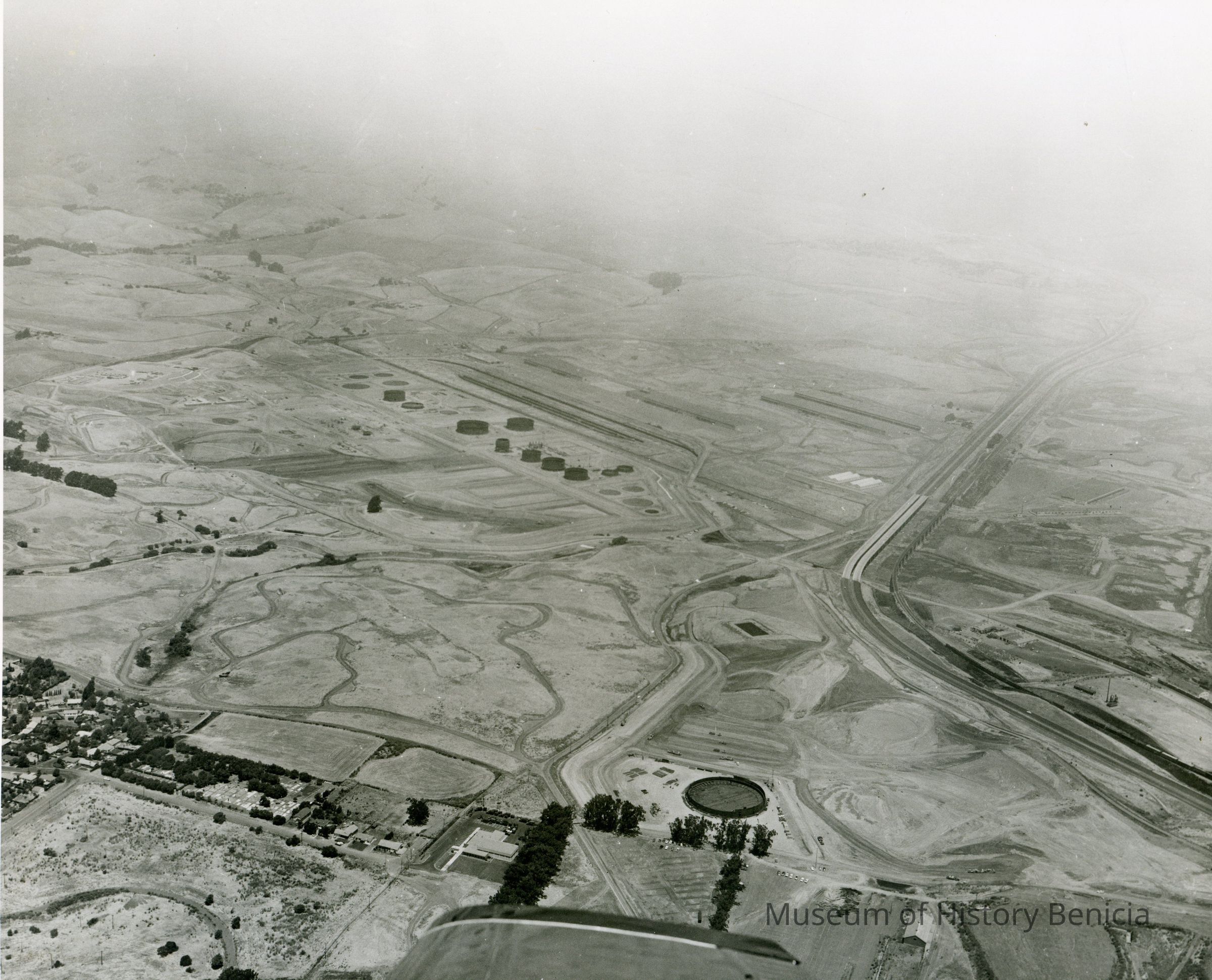B/W aerial photo of early construction of the Humble Oil Refinery (later Exxon and Valero) looking north, upper section obscured by clouds; center area: storage tanks under construction, access roads and graded pads; right center: 68 freeway and railroad trestle; lower left: Highlands homes, St. Dominic's Cemetery and National Guard armory; lower right: single storage tank under construction, graded areas, a building and some trees.
