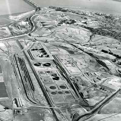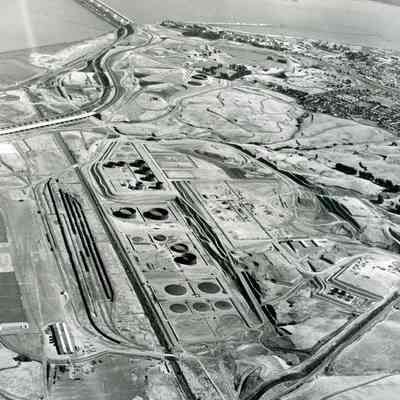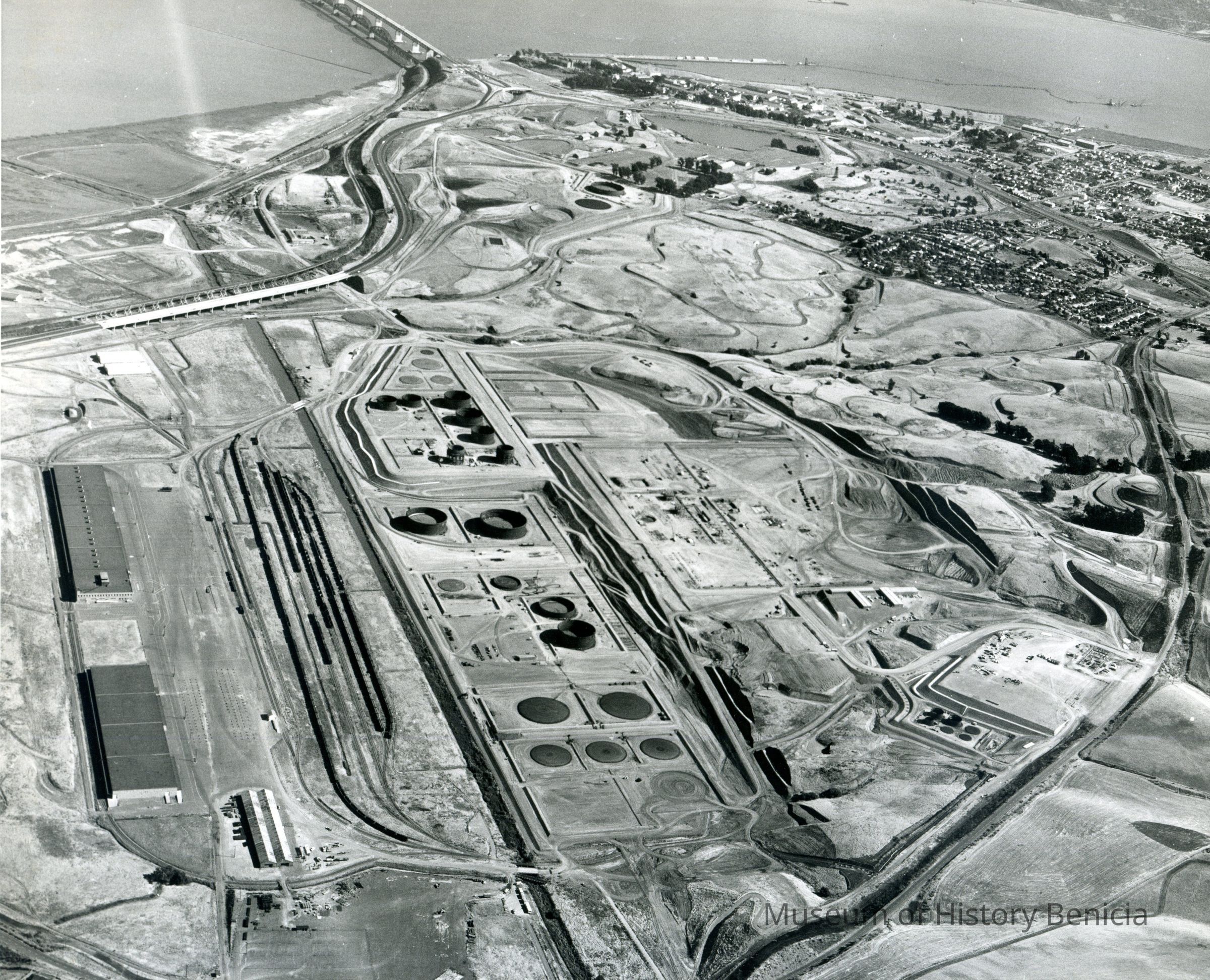 looking toward the southeast: at top: Benicia/Martinez and SP RR Bridges; 24 storage tanks in various stages of completion can be seen; East Second St goes from mid-bottom up the right side of the photo to the city; east side of Benicia (Highlands housing is visible) and Carquinez Straits are in the upper right; warehouses and train cars on sidings are in mid-to lover left area; hiway 680 goes from the bridge to the upper left; hiway 780 can be seen going from upper mid-right to the bridge; hill contours and graded areas can also be seen.Collection