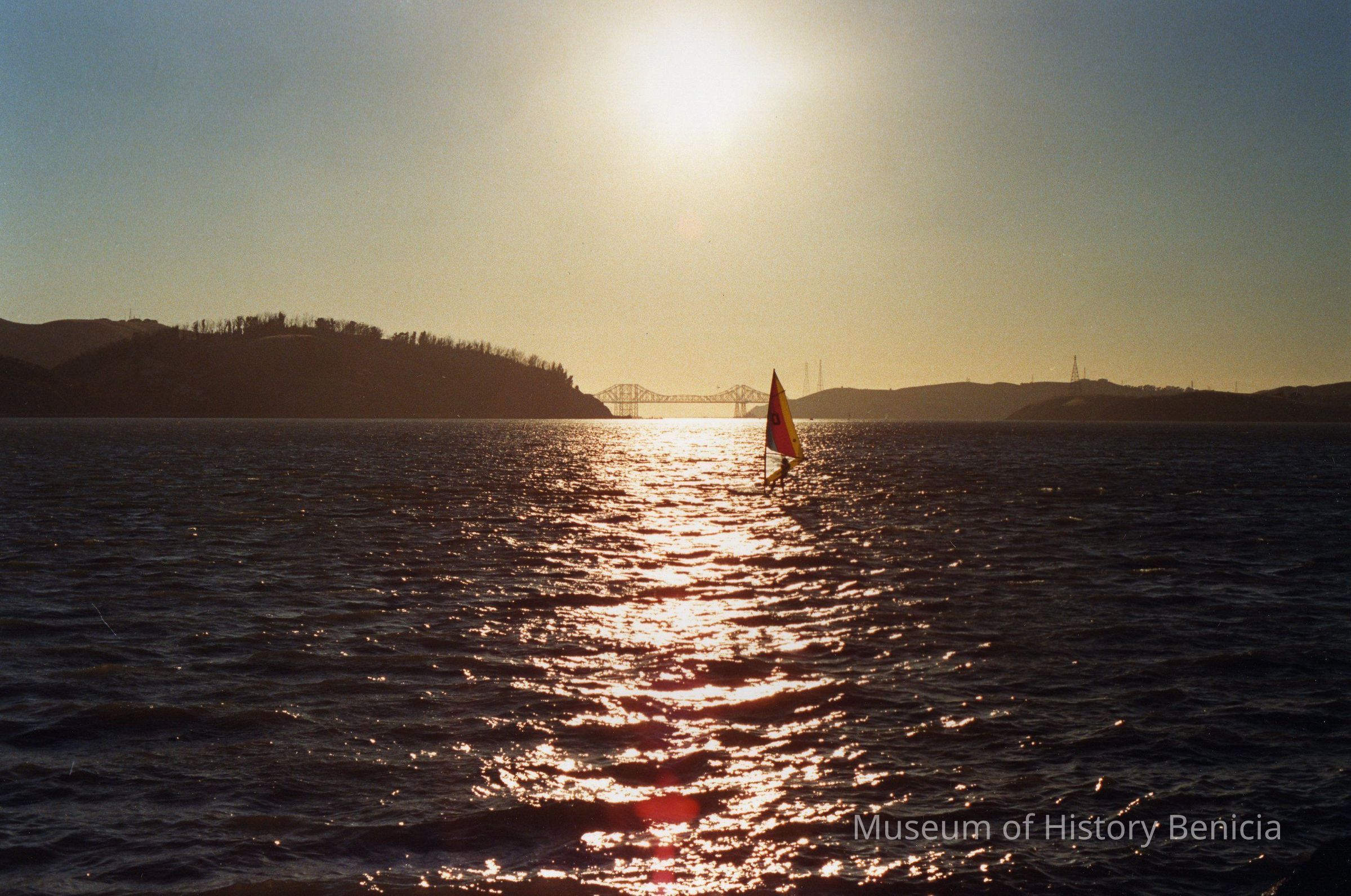 Late afternoon sun on the water. Windsurfer on the Carquinez Straits and the Carquinez bridge is in the background.