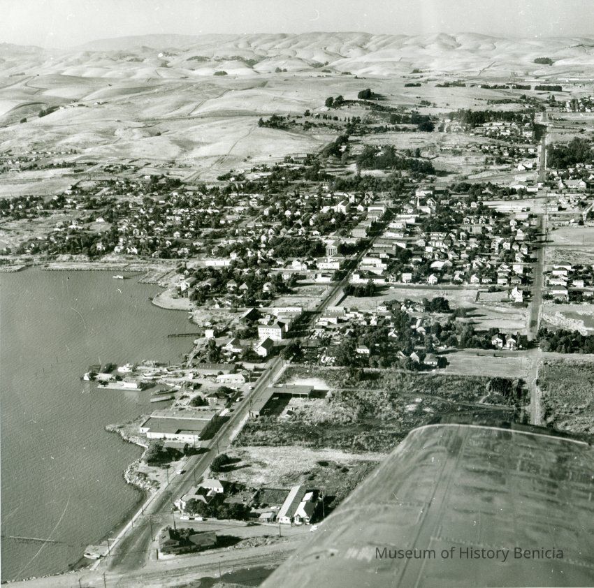 B/W aerial photo of downtown Benicia looking north from the foot of First Street. The SP Train Depot and buildings (that have since been torn down or moved) appear at the bottom of the photo along with an airplane wing;