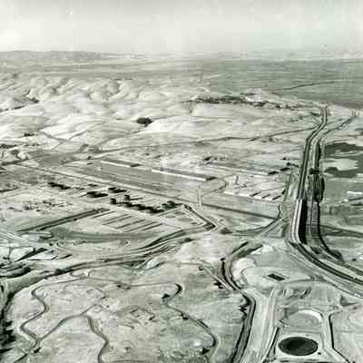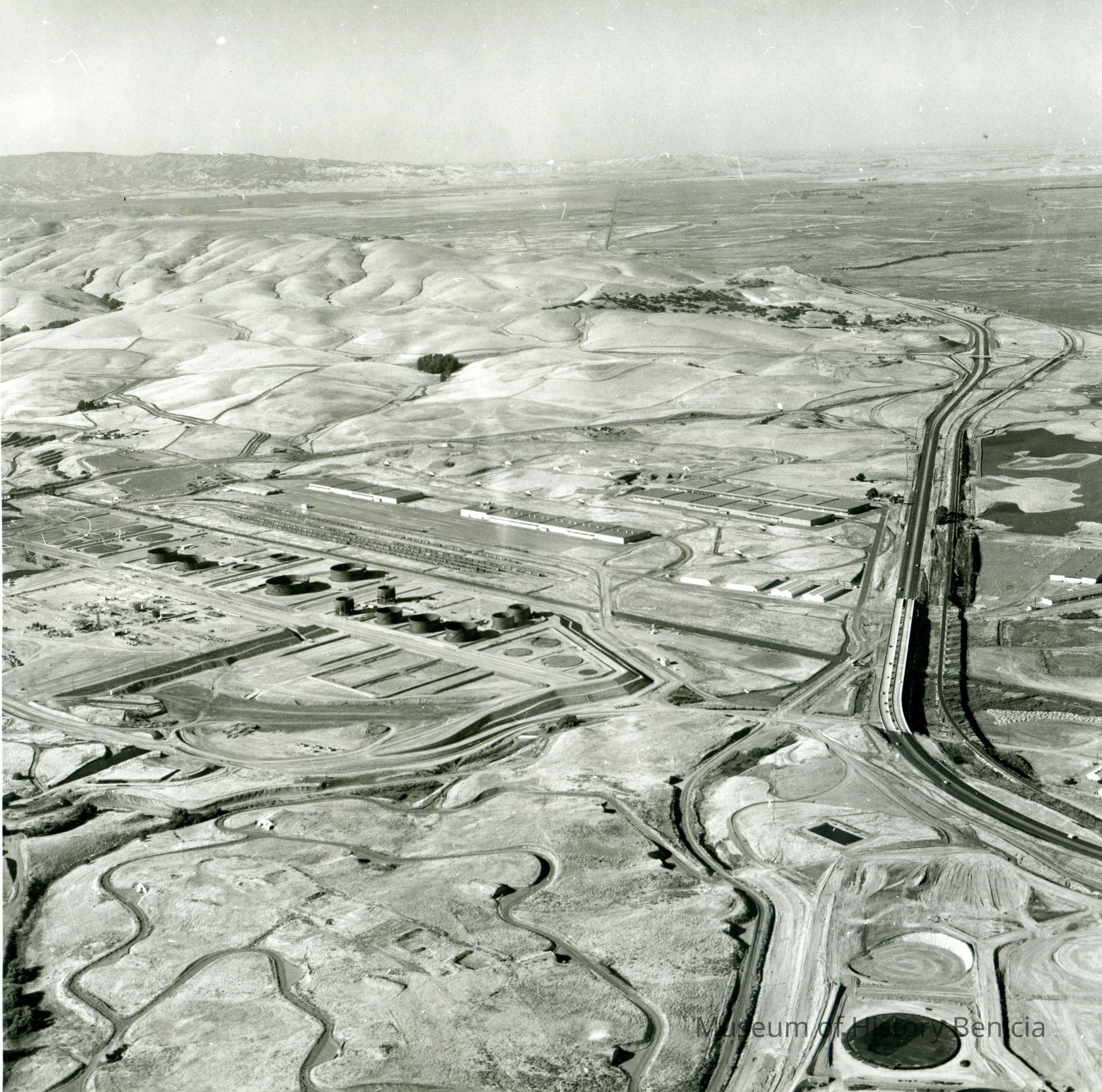 looking north; 680 freeway is at the right; center shows approximately 17 storage tanks/pads in various stages of completion, also warehouses and train cars on sidings; East Second Street goes from mid-left to connection with hiway 680 at the right; marshes and hills are at the top, graded areas and access roads are at the bottom.Collection