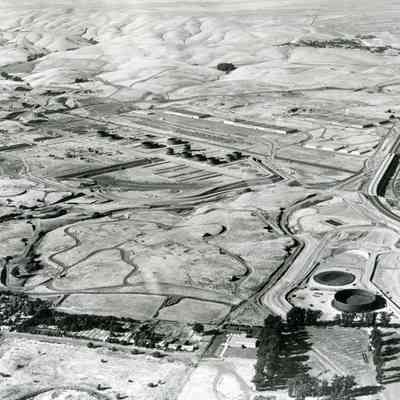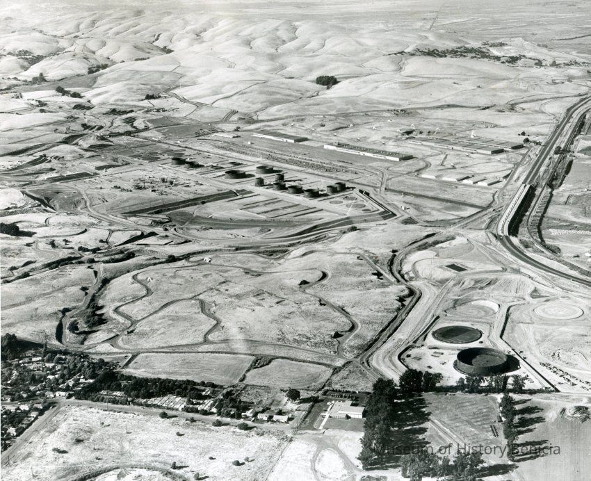 looking north-northwest; center: storage tanks and other refining equipment under construction, warehouses and railroad cars on sidings and in-hill storage bunkers; bottom: St. Dominic's cemetery and Highlands housing (bottom left corner), National Guard armory and trees with more storage tanks; Highway 680 is at the right.Collection