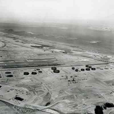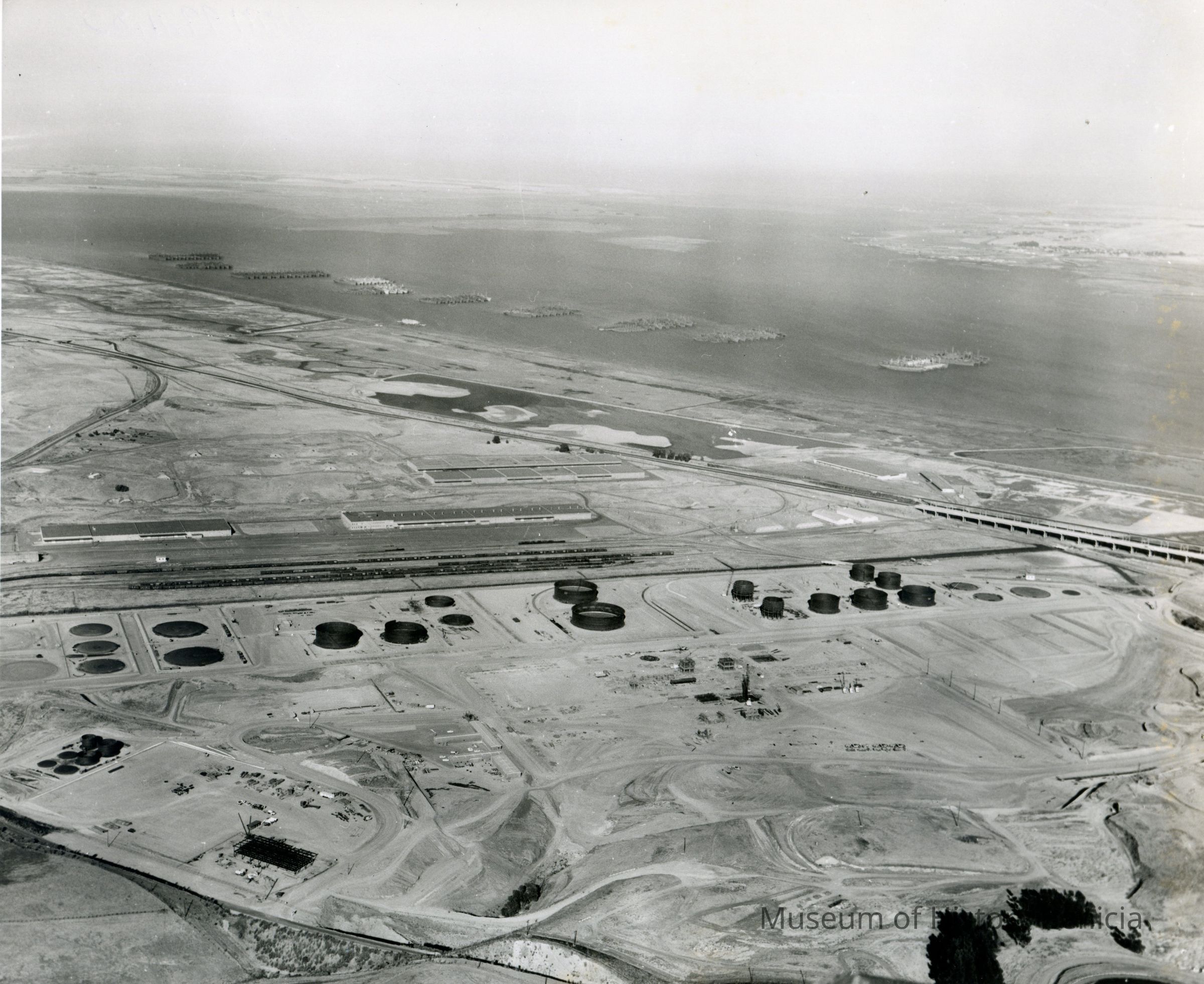 B/W aerial photo of early construction of the Humble Oil Refinery (later Exxon and Valero); northeast view; top: Suisun Bay w/mothball-Reserve fleet ships, Contra Costa County above; Hiway 680 goes from right to left just above center; center: storage tanks and other equipment in various stages of construction, warehouses and railroad cars on sidings;