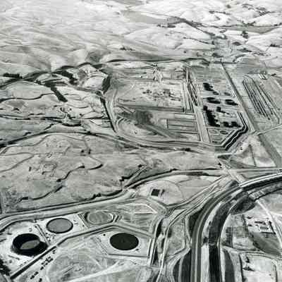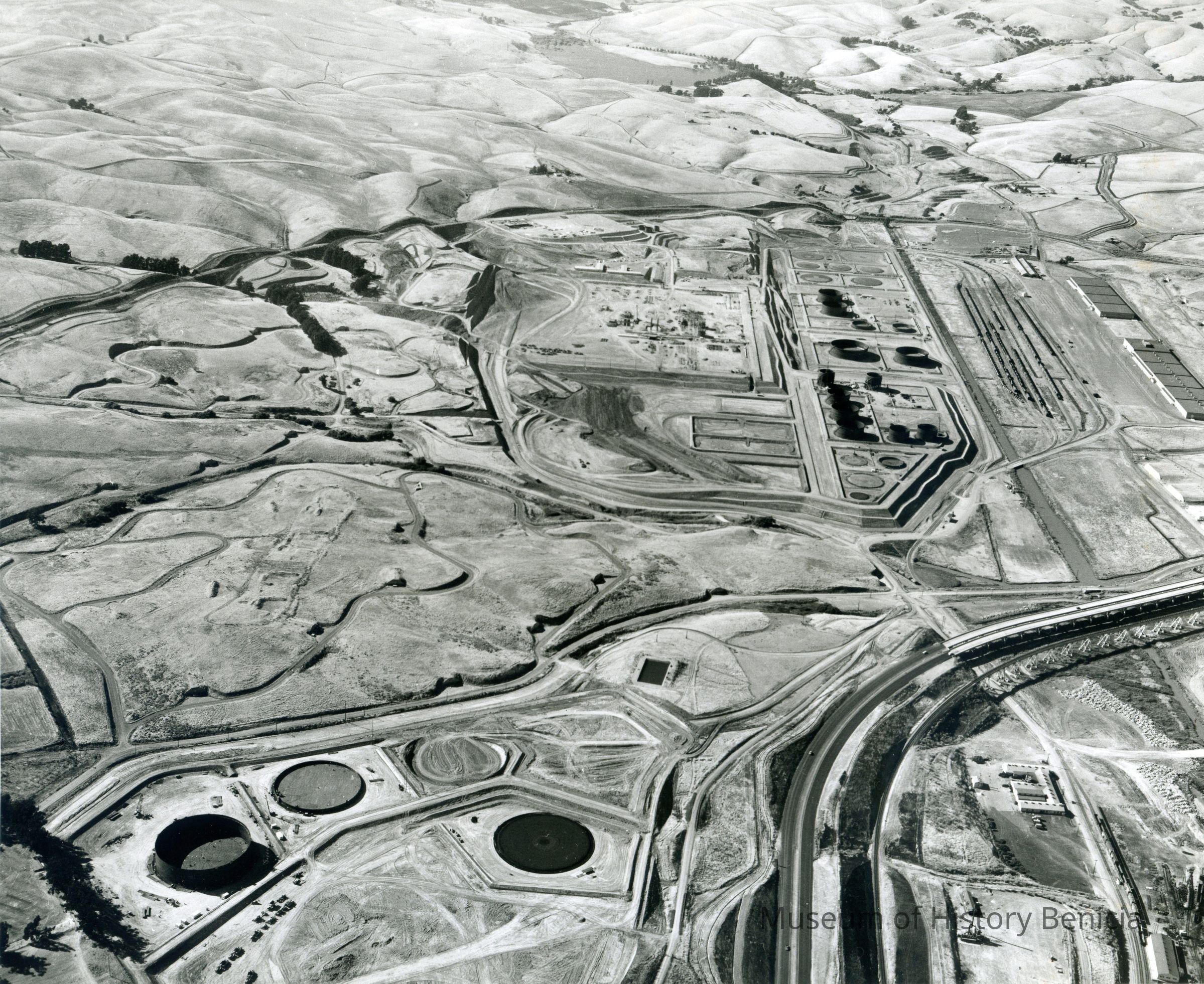 lower left area: large tanks and graded pads along with construction roads are visible;