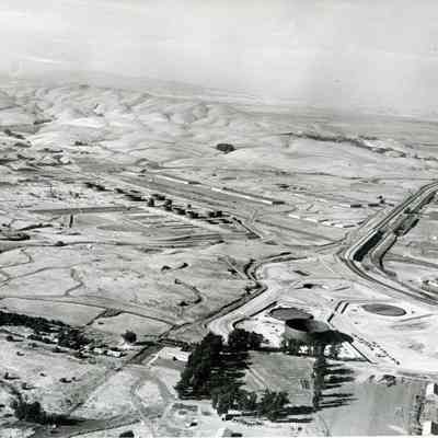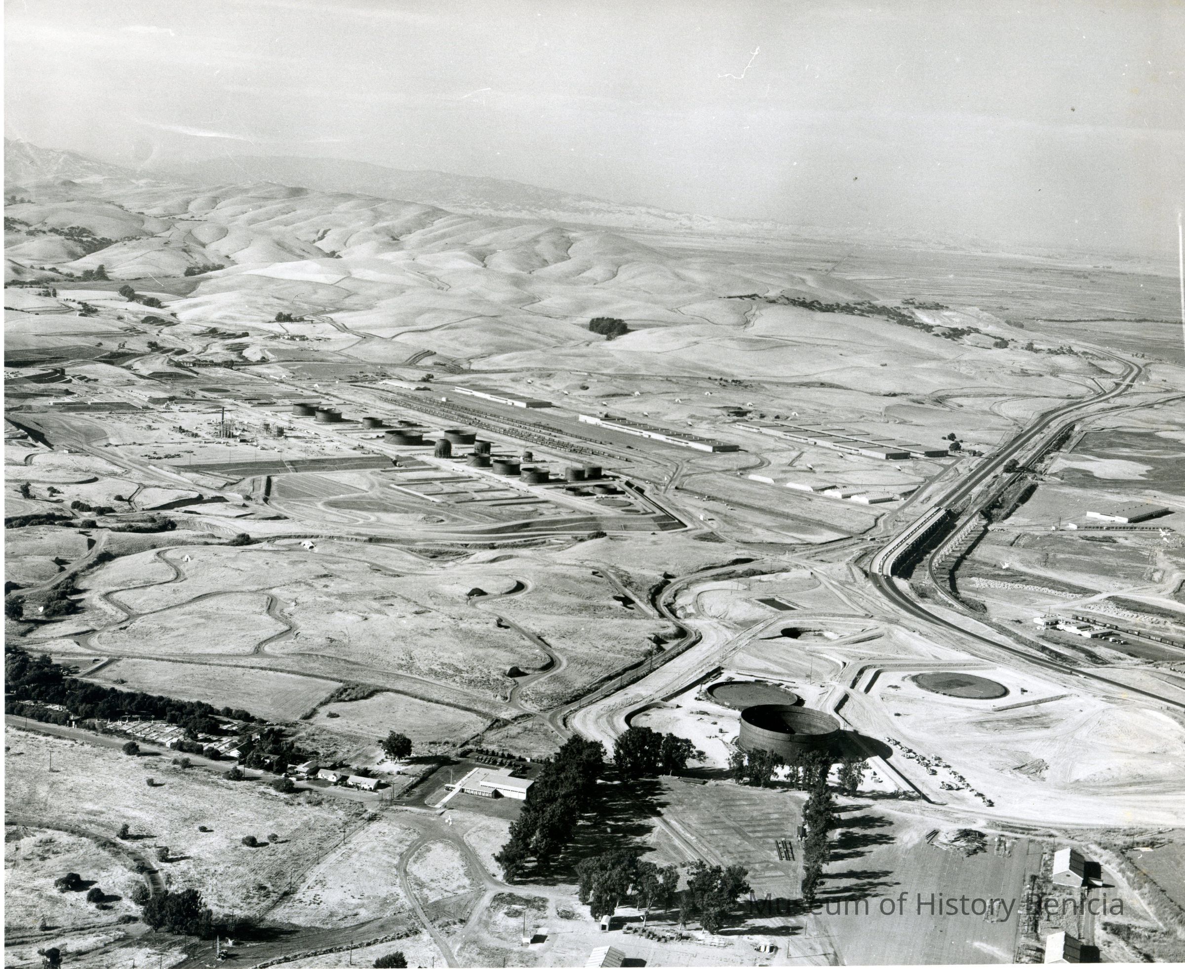 B/W aerial photo of early construction of the Humble Oil Refinery (later Exxon and Valero) looking north: lower area: left to right: St. Dominic's Cemetery, houses on Hillcrest Avenue, National Guard Armory (military vehicles next to building), lines of trees (in a square) and other small buildings; lower center: left to right: graded areas, a tank and two pads under construction, construction equipment; center: left to right: storage tanks and other equipment under construction, warehouses, railroad cars on sidings, old Arsenal storage buildings (semi bunkers), hiway 680 and railroad tracks/trestle, other buildings; upper area: left to right: hills, groves of trees, marshes.Collection