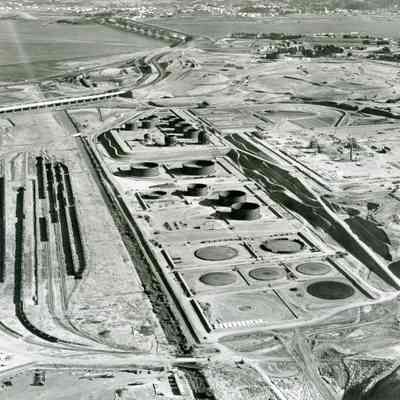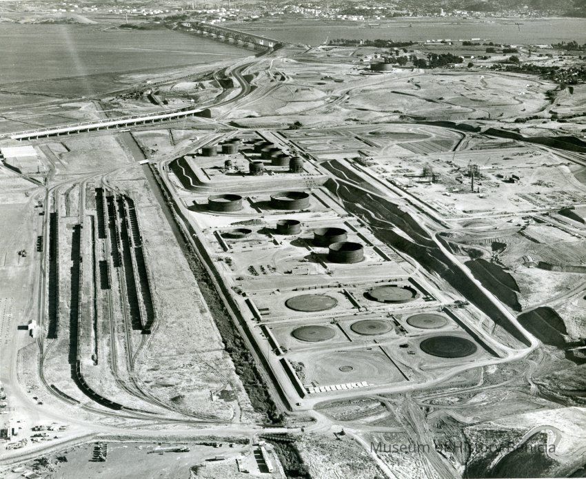 B/W aerial photo of early construction of the Humble Oil Refinery (later Exxon and Valero) looking toward the east: top: Benicia/Martinez bridge and SP RR bridge, City of Martinez, Carquinez Strait; upper center: left to right: Hiway 680 and railroad tracks, far east side City of Benicia; center: left to right: train cars on sidings, storage tanks and pads in varying degrees of construction, other refining equipment under construction; bottom: left to right: construction equipment and other vehicles, storage trailers, access roads and graded areas.Collection