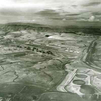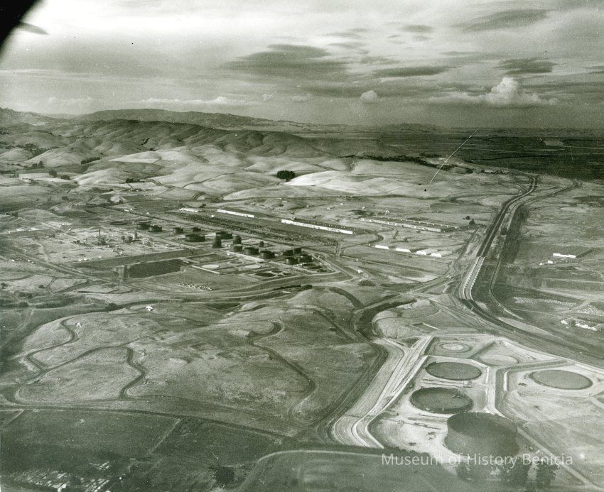 B/W aerial photo of early construction of the Humble Oil Refinery (later Exxon and Valero) looking north: at top: cloudy skies, empty rolling hills; across center: left to right: refining equipment being assembled, storage tanks under construction, railroad cars on sidings, warehouses, hiway 680, railroad tracks, more buildings; below center: (near bottom) fields, access roads, storage tanks under construction; at bottom: left corner: St. Dominic's cemetery; center: airplane wing tipCollection