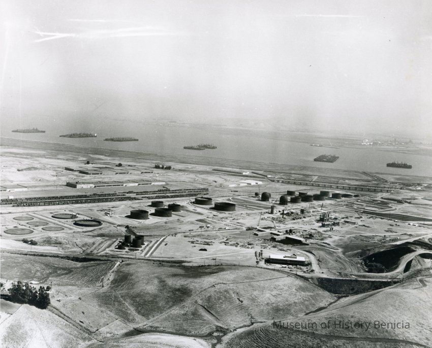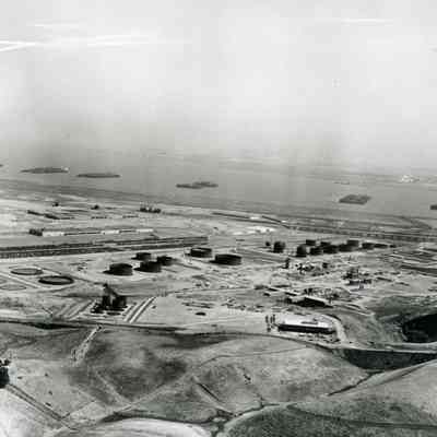 B/W aerial photo of early construction of the Humble Oil Refinery (later Exxon and Valero) looking northeast: at top: hazy skies, Contra Costa County, marshes, Suisun Bay Reserve/Mothball Fleet; across center: warehouses, railroad cars on sidings, storage tanks under construction, hiway 680; below center: left to right: storage tank pads, refining equipment being assembled, administration building; across bottom: East Second Street, empty rolling hills, drainage areasCollection