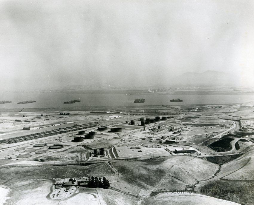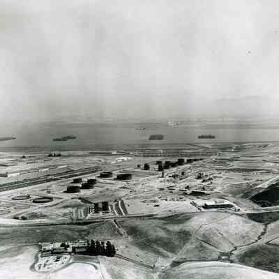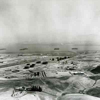 B/W aerial photo of early construction of the Humble Oil Refinery (later Exxon and Valero) looking east: at top: hazy skies, top of Mt. Diablo, small refinery, Suisun Reserve/Mothball Fleet; across center: warehouses, railroad cars on sidings, storage tanks under construction, refining equipment being assembled, administration building, empty hills; at bottom: small farm w/barn, water tower, out buildings, house, trees, fences, empty fields.Collection