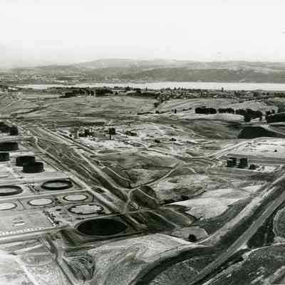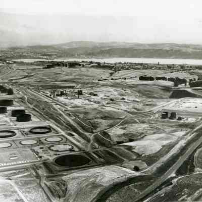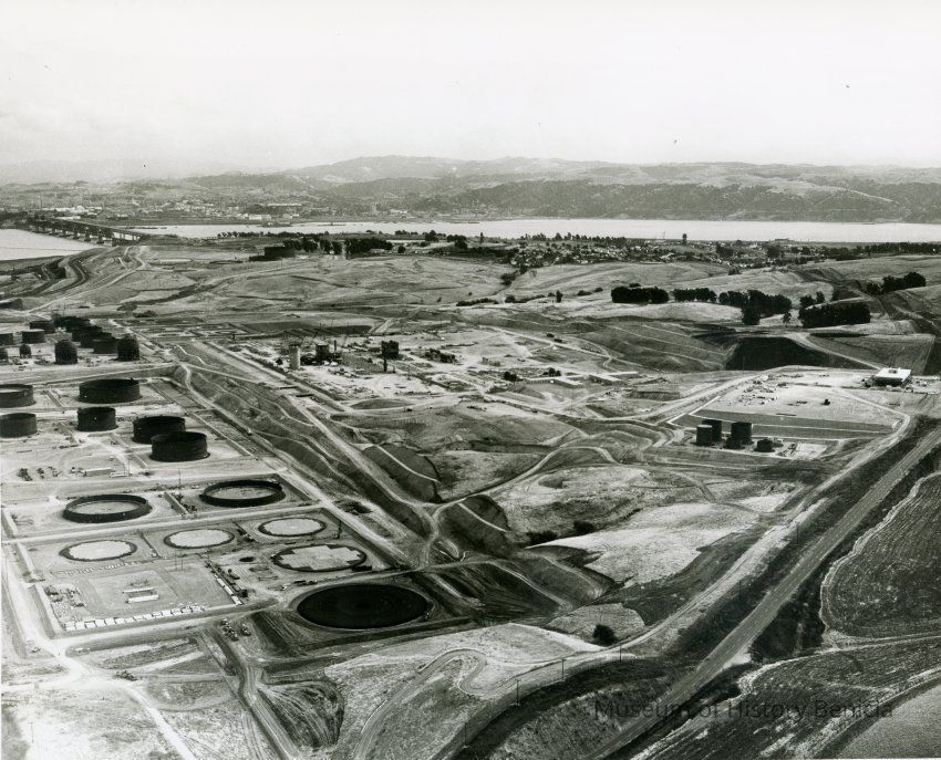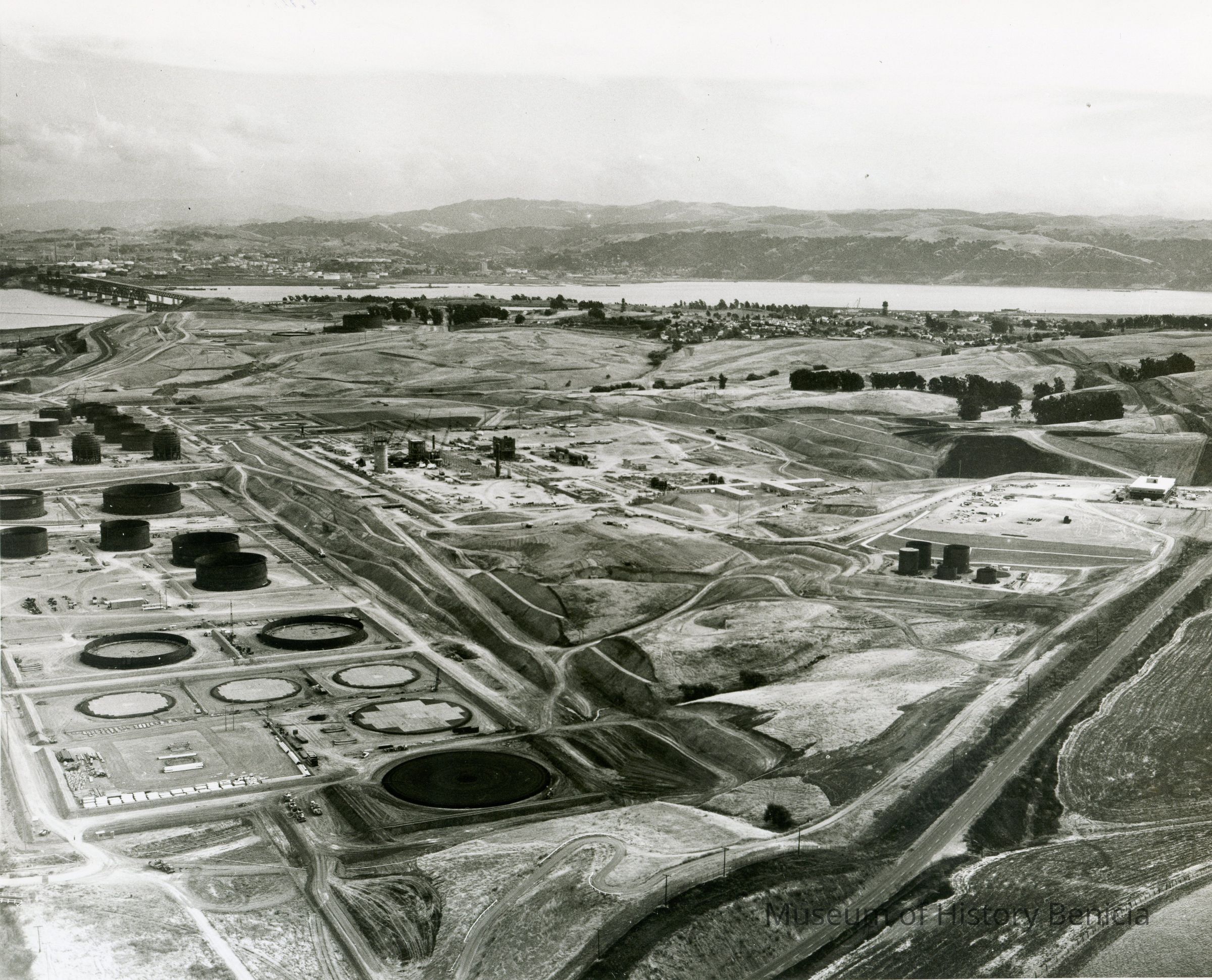 B/W aerial photo of early construction of the Humble Oil Refinery (later Exxon and Valero) looking southeast: at top: hills of Contra Costa County; above center: Benicia/Martinez Bridge and SP Railroad Bridge, City of Martinez, Carquinez Strait, east side of Benicia, Highlands Housing development; across center: storage tanks under construction, refining equipment being assembled; graded parking area w/vehicles, administration building; at bottom: concrete pads, hills w/access roads and East Second Street.Collection