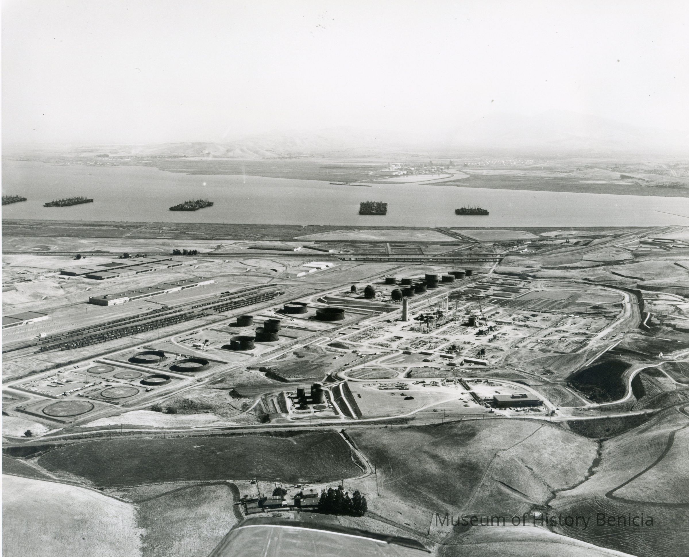 B/W aerial photo of early construction of the Humble Oil Refinery (later Exxon and Valero) looking east: at top: hazy skies, Mt. Diablo faintly visible, small refinery on Contra Costa County side of the straits, ships in the Suisun Reserve/Mothball Fleet; above center: hiway 680, marshes; across center: warehouses, railroad cars on sidings, storage tanks under construction, refining equipment being assembled, graded areas w/access roads, administration building; below center: East Second Street, empty fields; across very bottom: empty fields, small farm w/buildings, trees and tip of airplane wing.Collection
