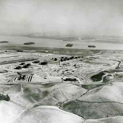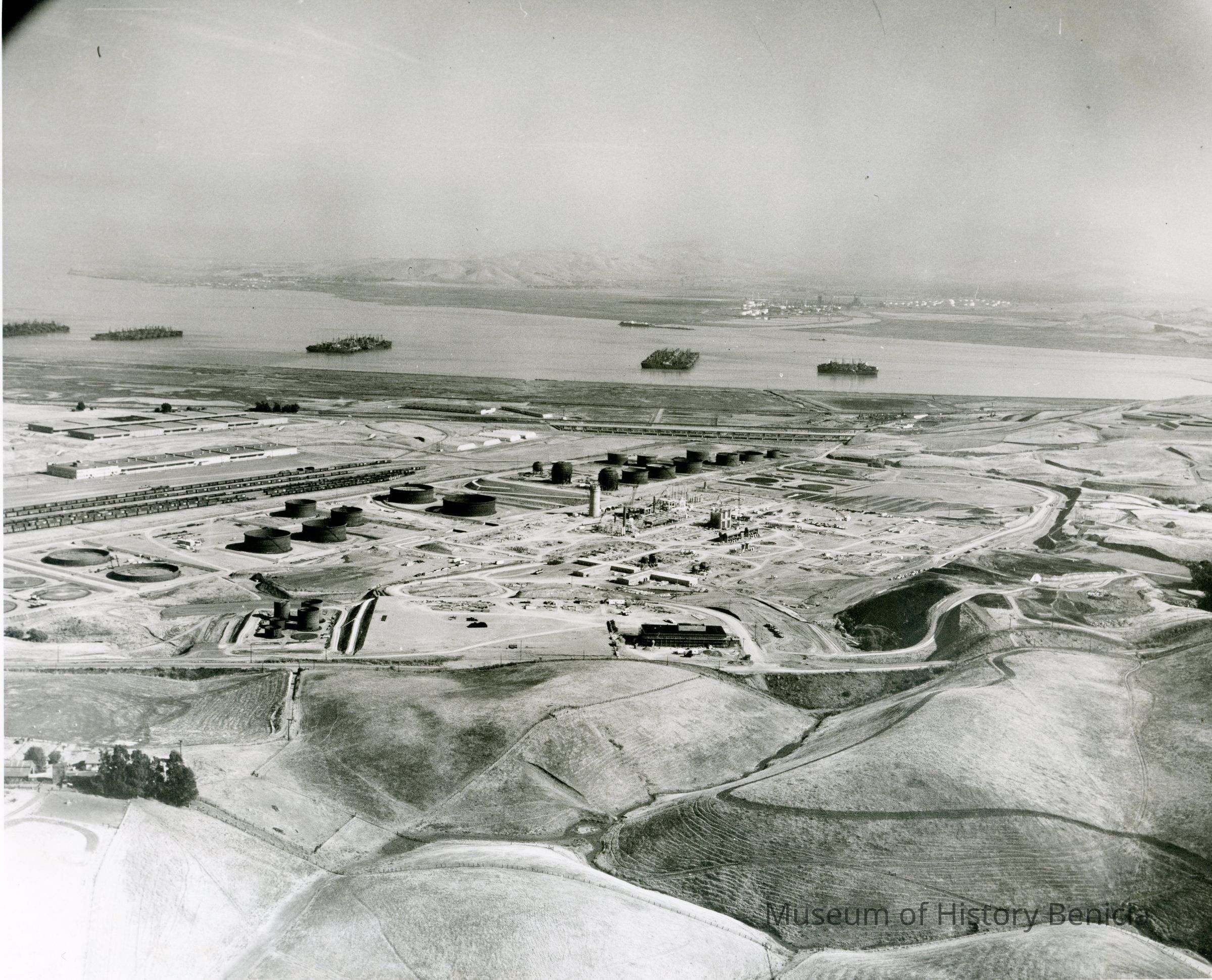 B/W aerial photo of early construction of the Humble Oil Refinery (later Exxon and Valero) looking east: at top: hazy skies (cannot see Mt. Diablo), small refinery on Contra Costa side of the straits, ships in the Suisun Reserve/Mothball Fleet; across center: hiway 680, warehouses, railroad cars on sidings, storage tanks under construction, refinery equipment being assembled, administration building, numerous construction and personal vehicles, empty hills, in-hill storage bunkers; across bottom: part of a small farm, East Second Street and empty fields.Collection