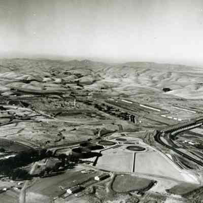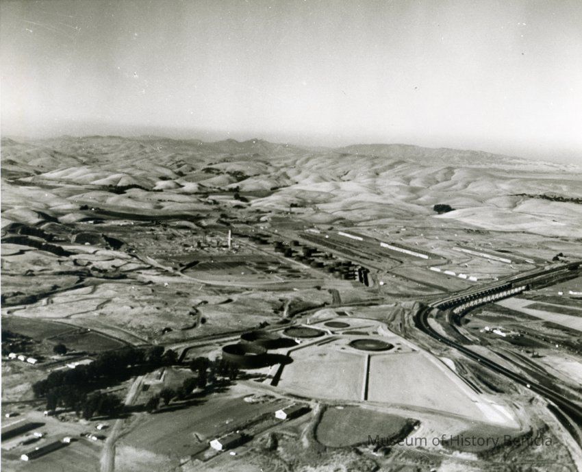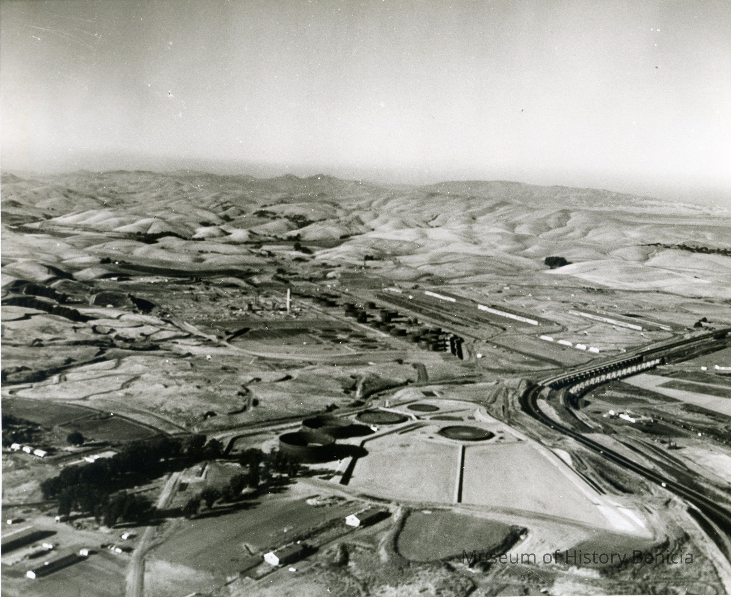 B/W aerial photo of early construction of the Humble Oil Refinery (later Exxon and Valero) looking northwest: across top: large area of hazy sky above empty rolling hills; across center: refinery equipment under construction/being assembled, storage tanks under construction, railroad cars on sidings, warehouses; across bottom: residences on Hillcrest Avenue, various sized buildings, rows of trees around an empty square, storage tanks under construction, concrete pads, graded areas and curve of hiway 680 and railroad tracks w/trestle.Collection