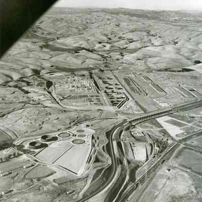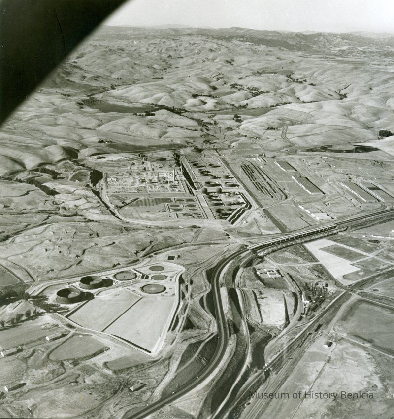 B/W aerial photo of early construction of the Humble Oil Refinery (later Exxon and Valero) looking northwest: across top: empty rolling hills, Lake Herman; across center: empty hills, graded areas, East Second Street, refining equipment being assembled, storage tanks under construction, railroad cars on sidings, warehouses; across below center: storage tanks under construction, concrete pads, hiway 680, railroad tracks w/trestle, empty industrial building sites.Collection