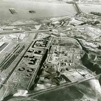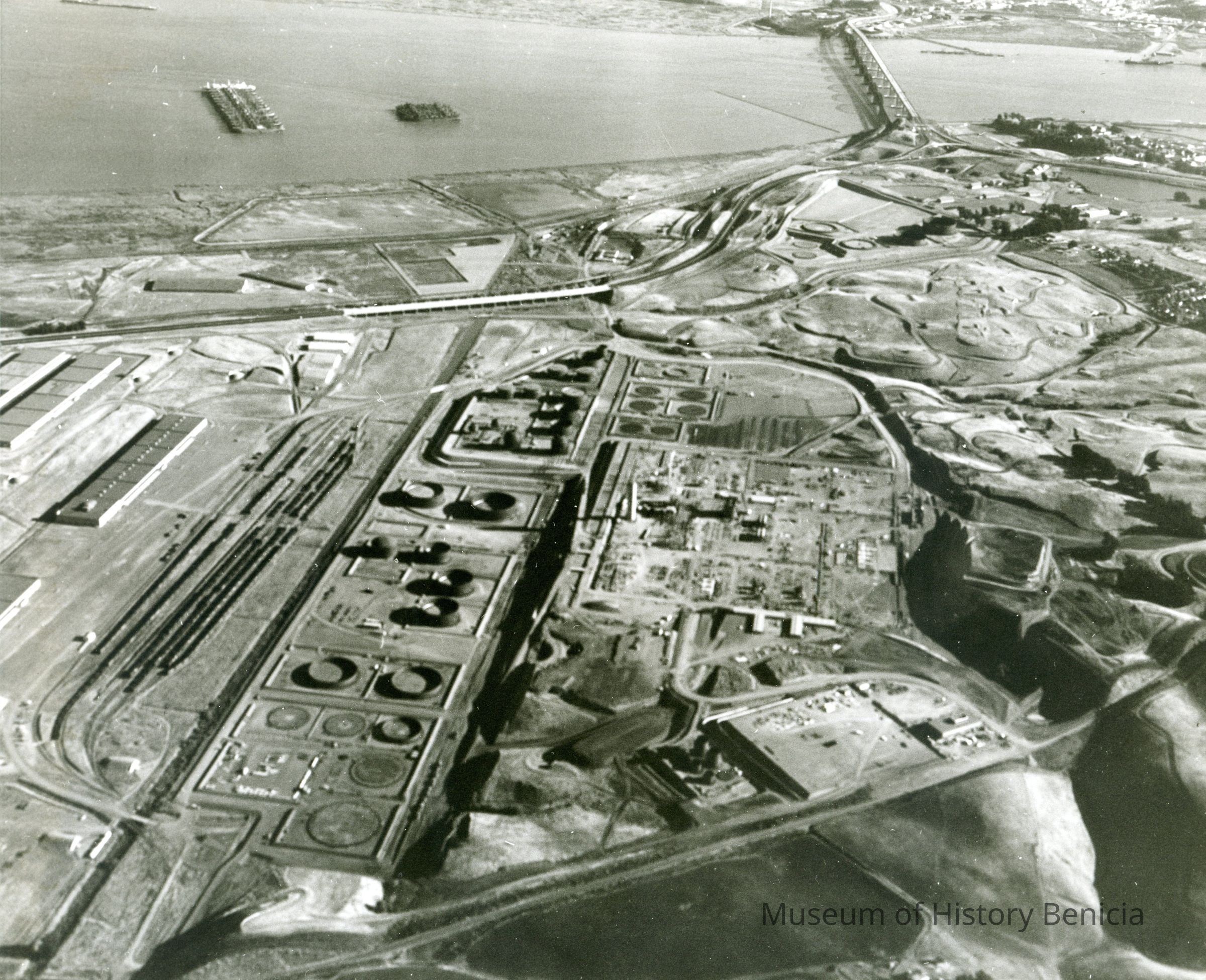 B/W aerial photo of early construction of the Humble Oil Refinery (later Exxon and Valero) looking east: (higher angle than others) across top: two sets of ships in the Suisun Reserve/ Mothball Fleet, SP Railroad and Benicia/Martinez bridges, Shell Oil Refinery, City of Martinez, eastern edge of City of Benicia; above center: hiway 680, storage buildings, empty industrial building sites, graded pads, storage tanks under construction; across center: warehouses, railroad cars on sidings, storage tanks in various stages of construction, refinery equipment being assembled, empty land w/access roads; across bottom: East Second Street, administration building, small vehiclesCollection