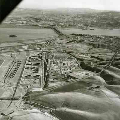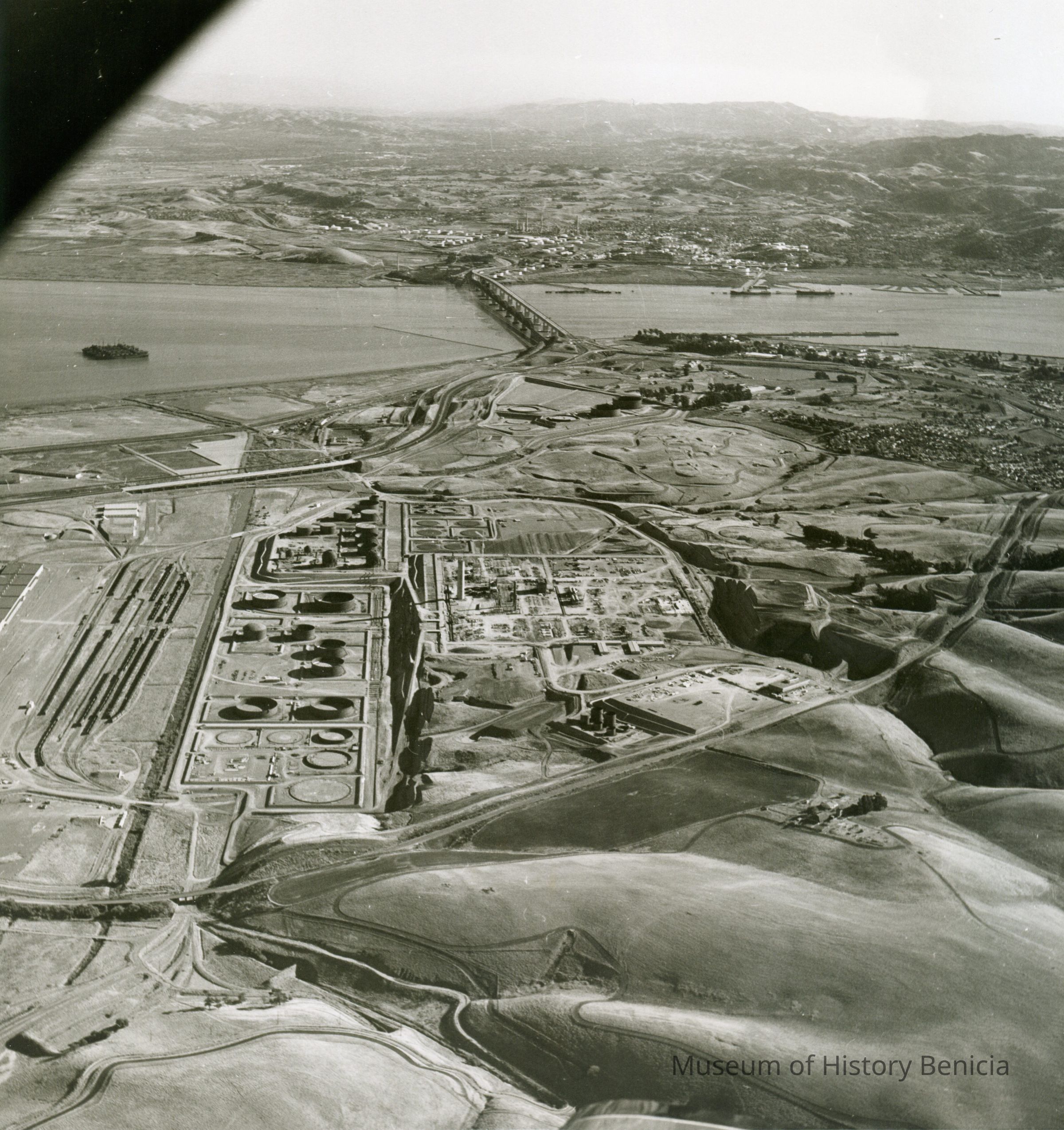 looking east southeast: across top: Shell Oil Refinery, City of Martinez, Contra Costa Hills; above center: one group of ships in Suisun Reserve/Mothball Fleet, SP Railroad and Benicia/Martinez bridges, Carquinez Strait; across center: warehouses, railroad cars on sidings, storage tanks under construction, refining equipment being assembled, empty fields, graded areas, access roads; across bottom: East Second Street, roads going under East Second Street, empty fields, access roads, small farm w/buildings and trees.Collection