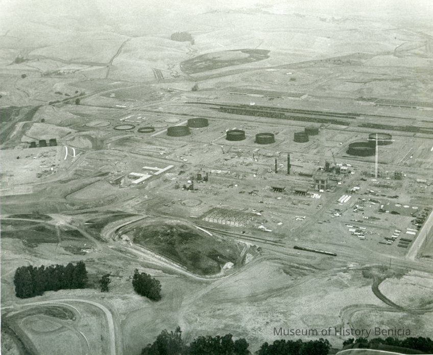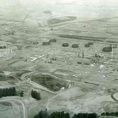 looking northwest: across top: empty hills, East Second Street, warehouses, railroad cars on sidings; across center: storage tanks under construction, two buildings, refining equipment being assembled, tall crane at right, construction and private vehicles; across bottom: empty fields, groups of trees, access roads.Collection
