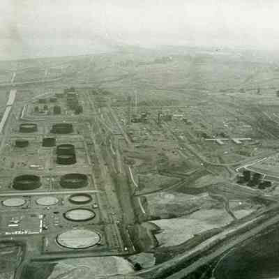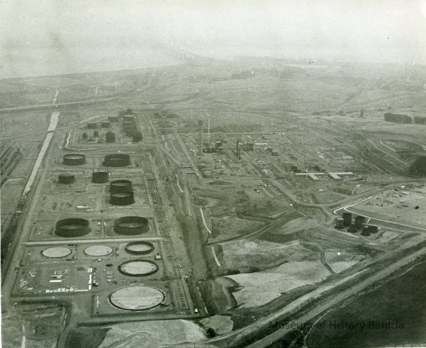 looking east: (hazy conditions) at top: can faintly see Carquinez Straits, SP Railroad and Benicia/Martinez bridges; across above center: hiway 680, railroad tracks, graded areas, some storage tanks under construction; across center: narrow water inlet, storage tanks in various stages of completion, refinery equipment being assembled, smoke stack is visible, buildings and terraced area; across bottom: storage tank pads, empty fields, more partially completed tanks and a number of vehicles.Collection